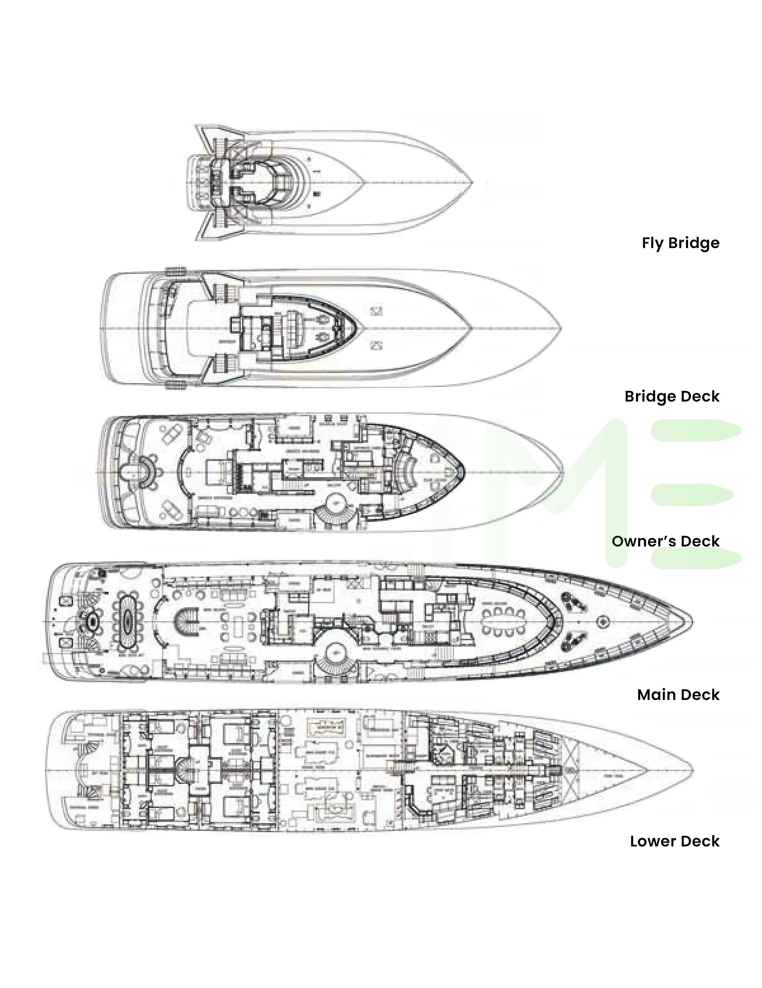 Request plans that include the layout of staterooms, guest areas, and outdoor spaces, as well as crew quarters and work areas.