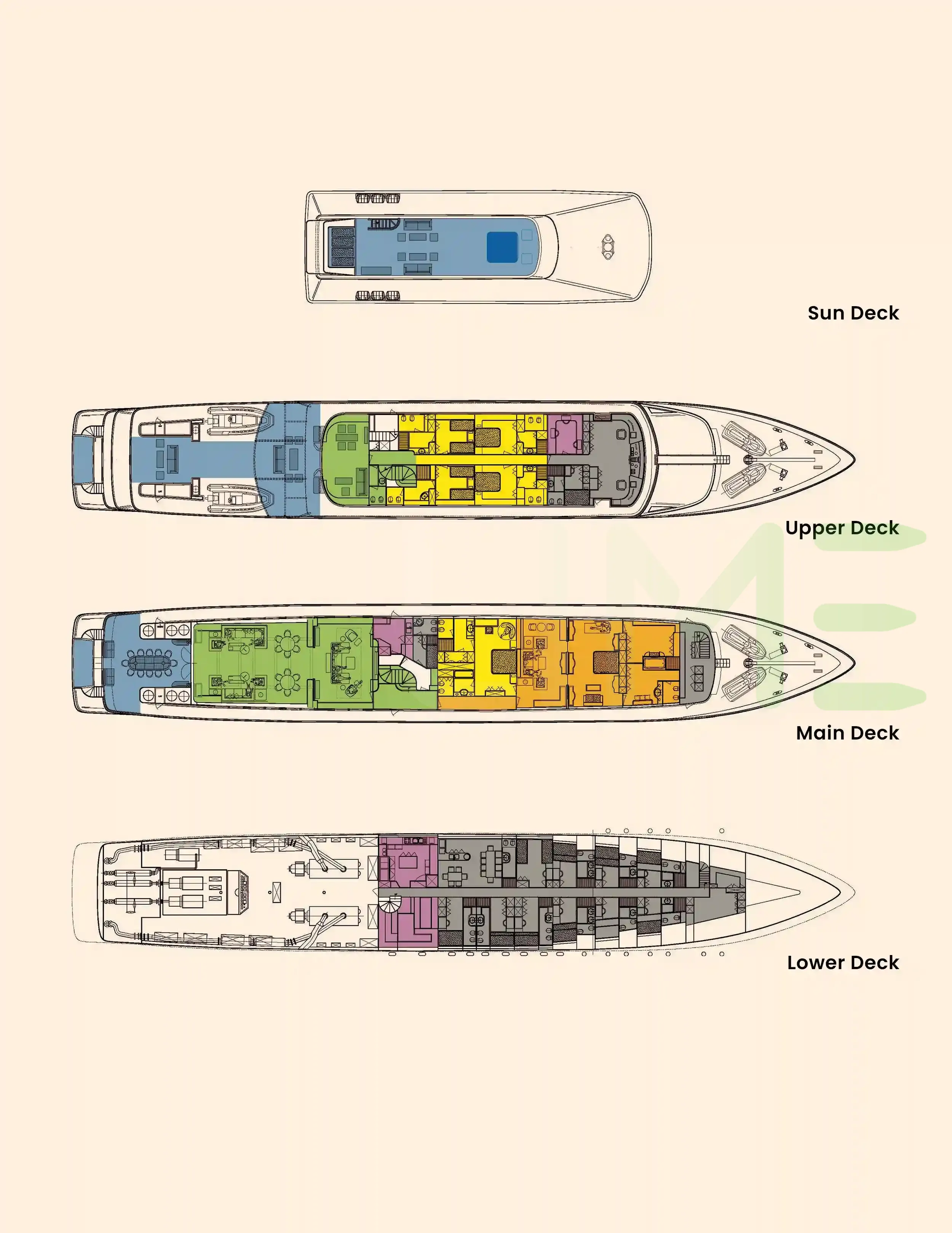 Request plans that include the layout of staterooms, guest areas, and outdoor spaces, as well as crew quarters and work areas.