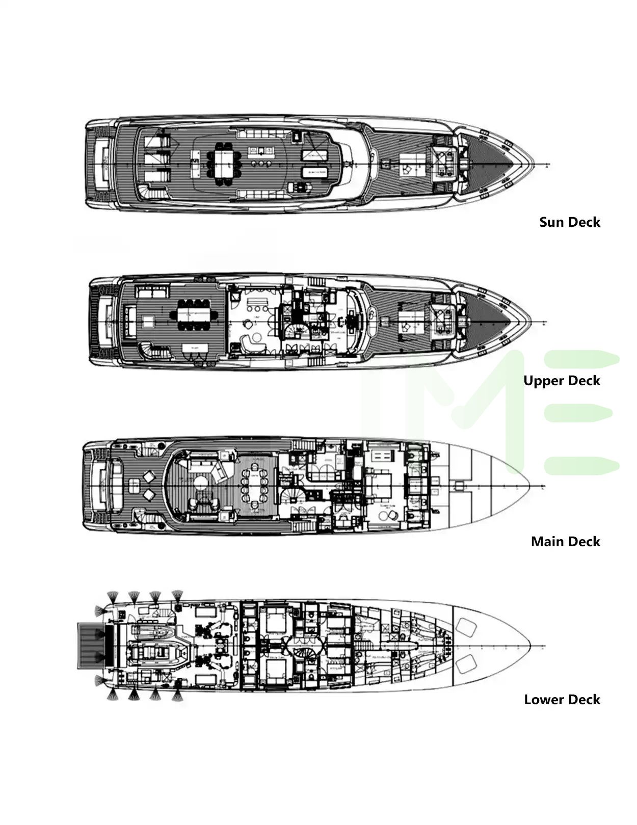 Request plans that include the layout of staterooms, guest areas, and outdoor spaces, as well as crew quarters and work areas.