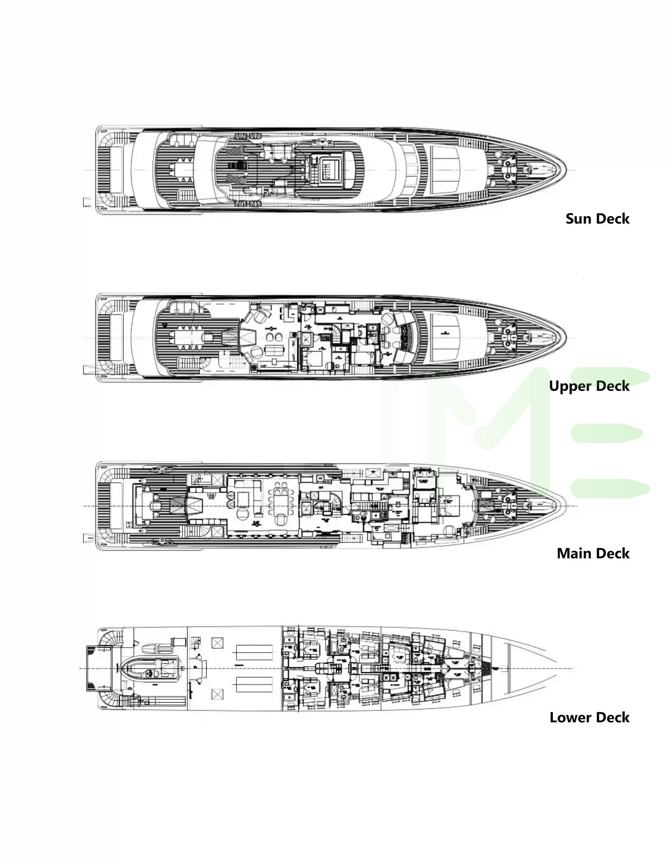 Request plans that include the layout of staterooms, guest areas, and outdoor spaces, as well as crew quarters and work areas.