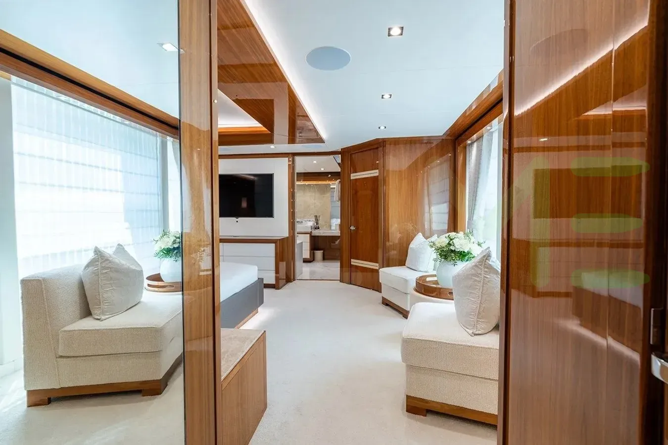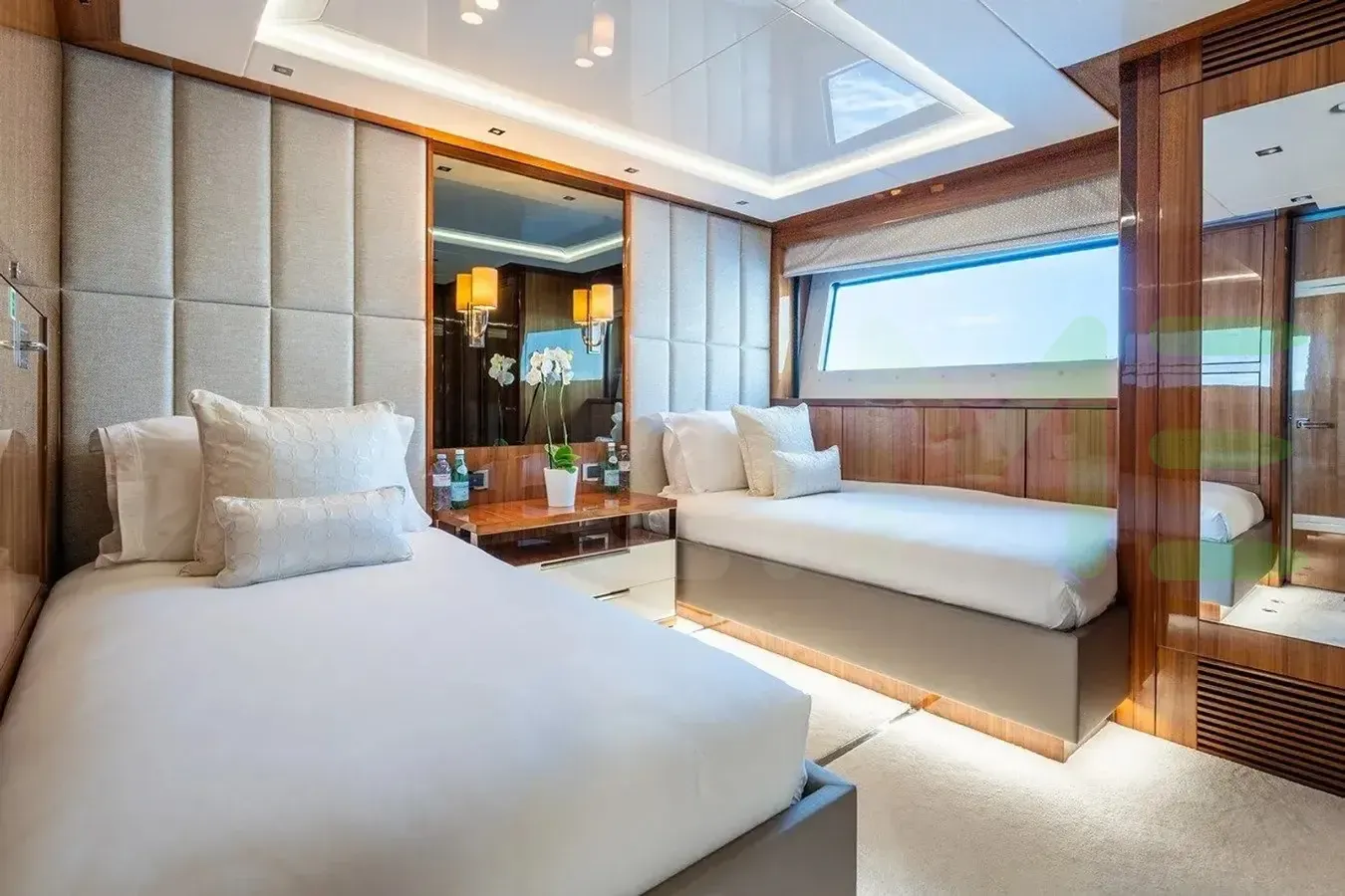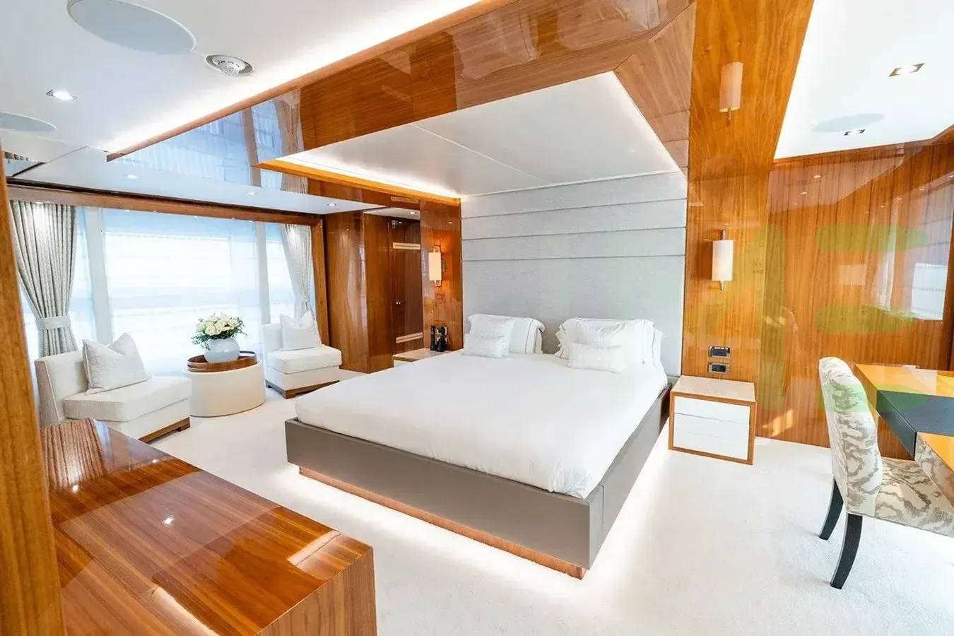 With a gross tonnage of 340, the ALADDIN yacht for charter provides ample interior space for enjoyment. ALADDIN offers accommodations for up to 10 guests in 5 lavishly appointed staterooms. She can also carry up to 8 crew onboard, including the Captain, to ensure a relaxed luxury yacht charter experience. The interior design by Sunseeker exudes a sense of luxury, seamlessly blending comfort with style.