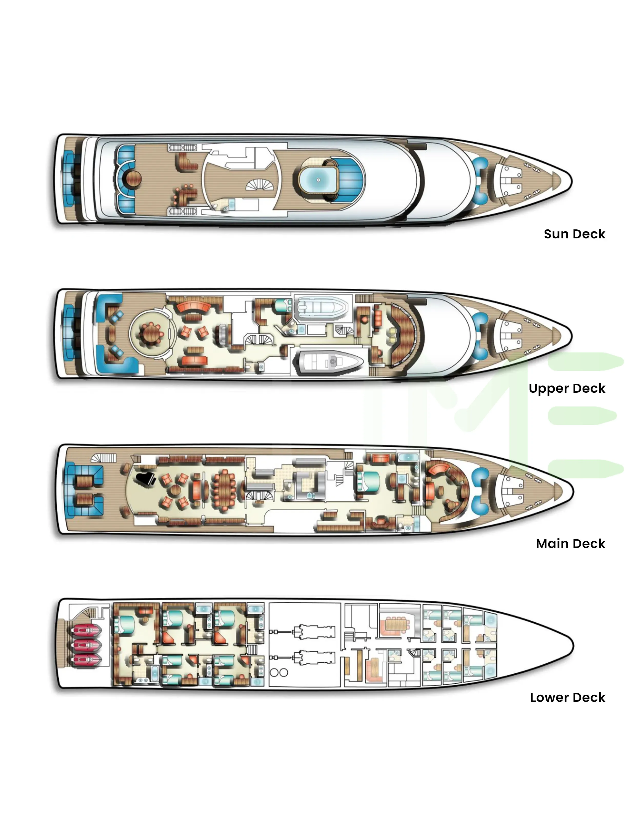 Request plans that include the layout of staterooms, guest areas, and outdoor spaces, as well as crew quarters and work areas.