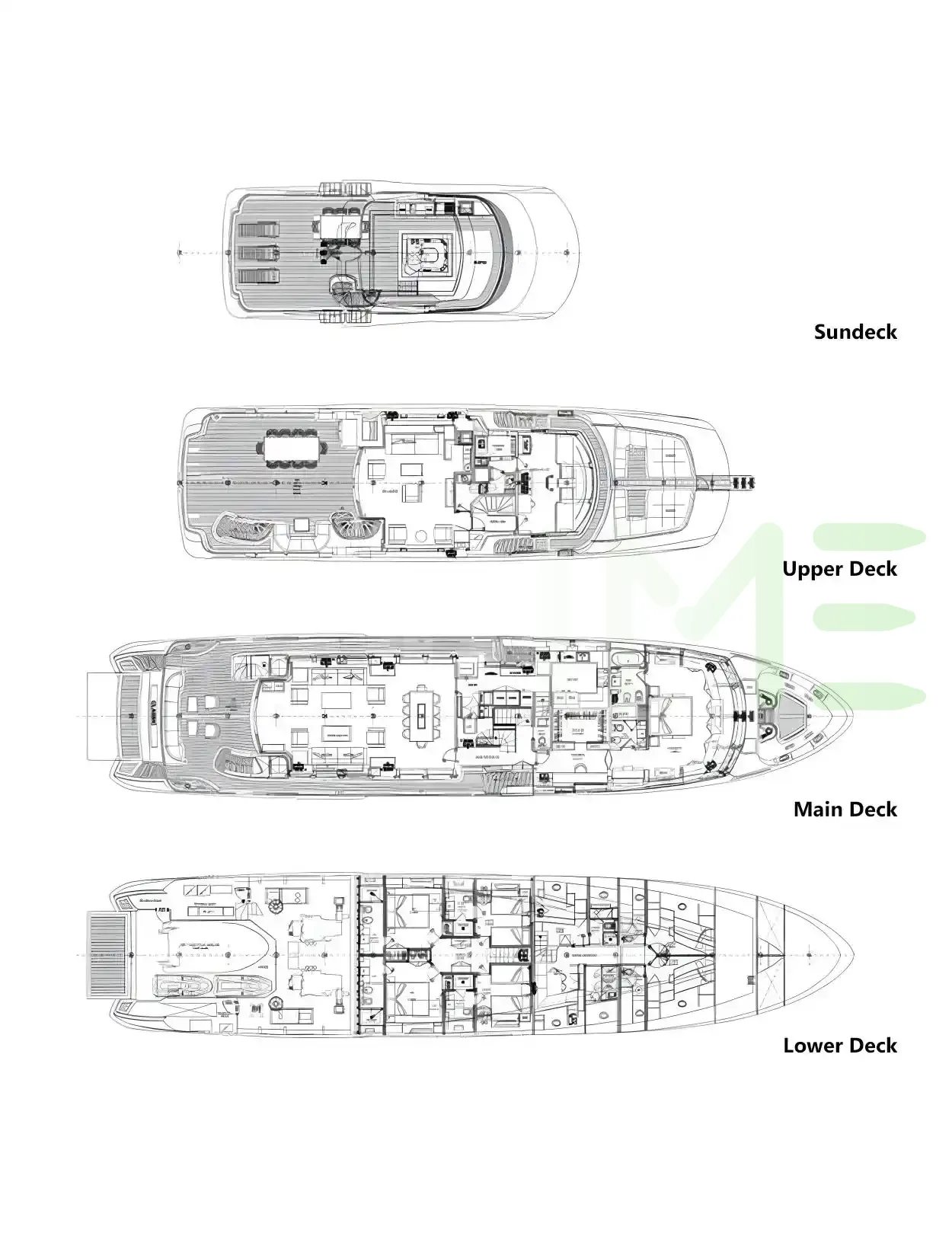 Request plans that include the layout of staterooms, guest areas, and outdoor spaces, as well as crew quarters and work areas.