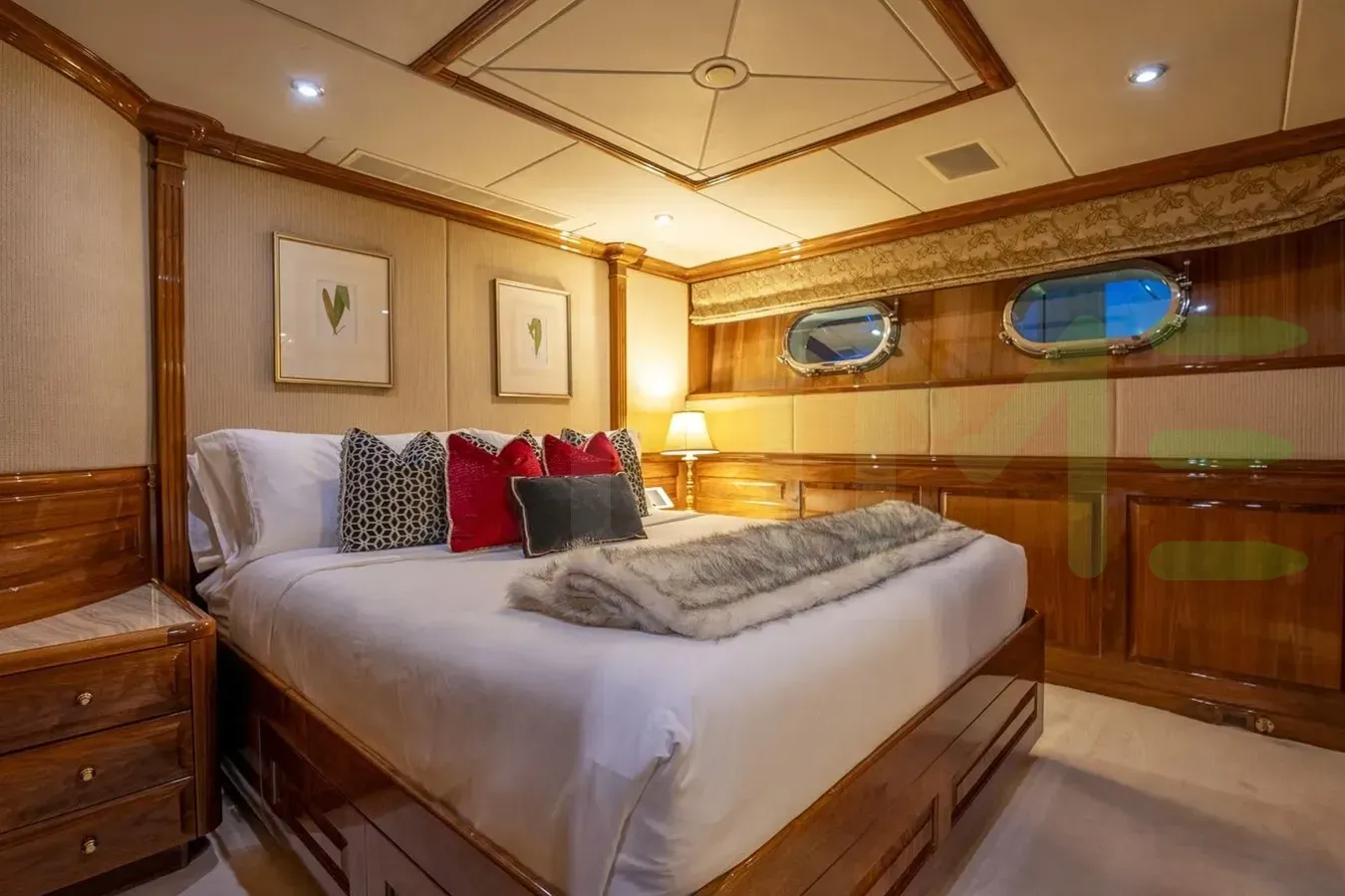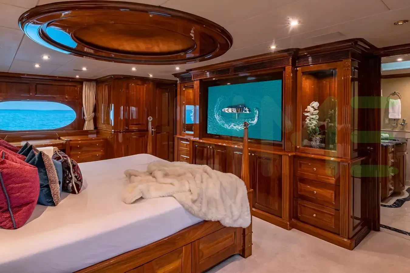 The exterior, designed by Christensen Shipyards, LLC., captures your attention with beautiful lines and impeccable craftsmanship. Whether you're lounging on the spacious decks or enjoying water sports in a secluded anchorage, the AMORE yacht for charter, built of GRP, offers a wealth of opportunities for relaxation and adventure.