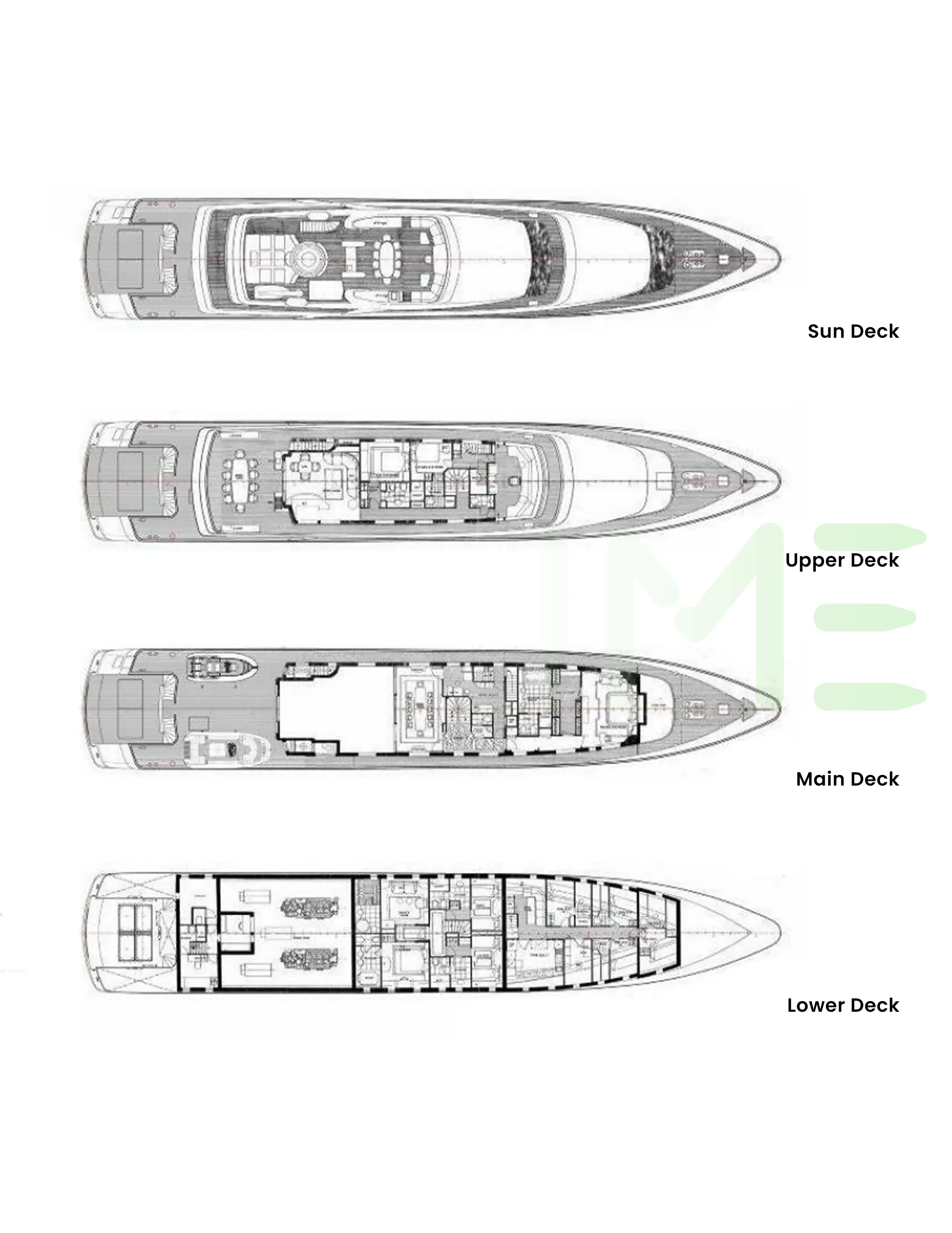 Request plans that include the layout of staterooms, guest areas, and outdoor spaces, as well as crew quarters and work areas.