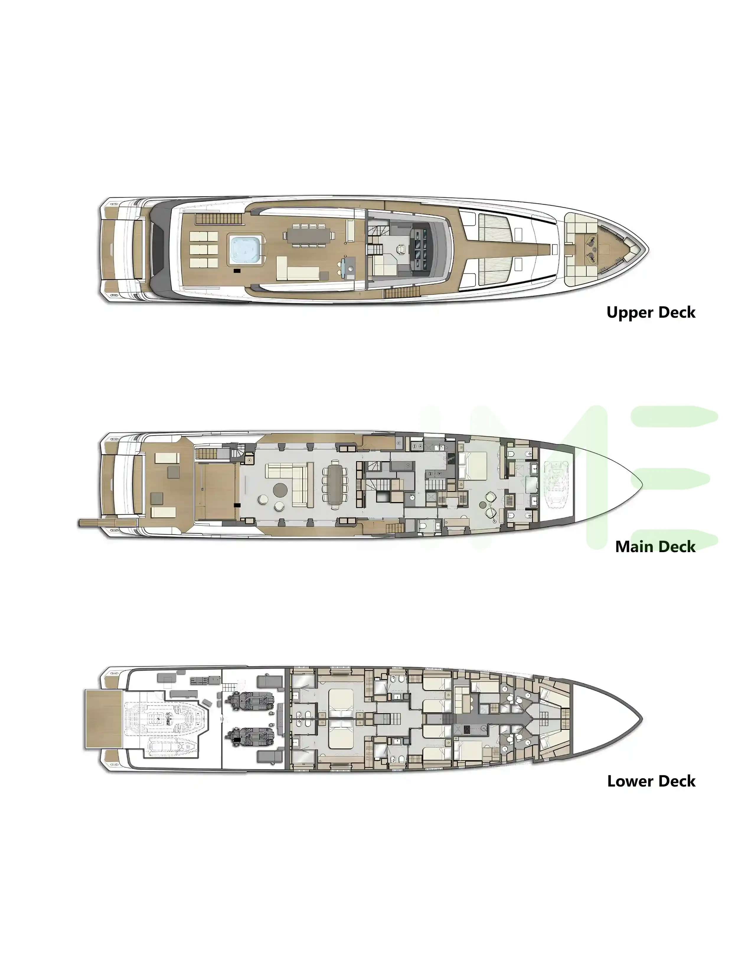 Request plans that include the layout of staterooms, guest areas, and outdoor spaces, as well as crew quarters and work areas.