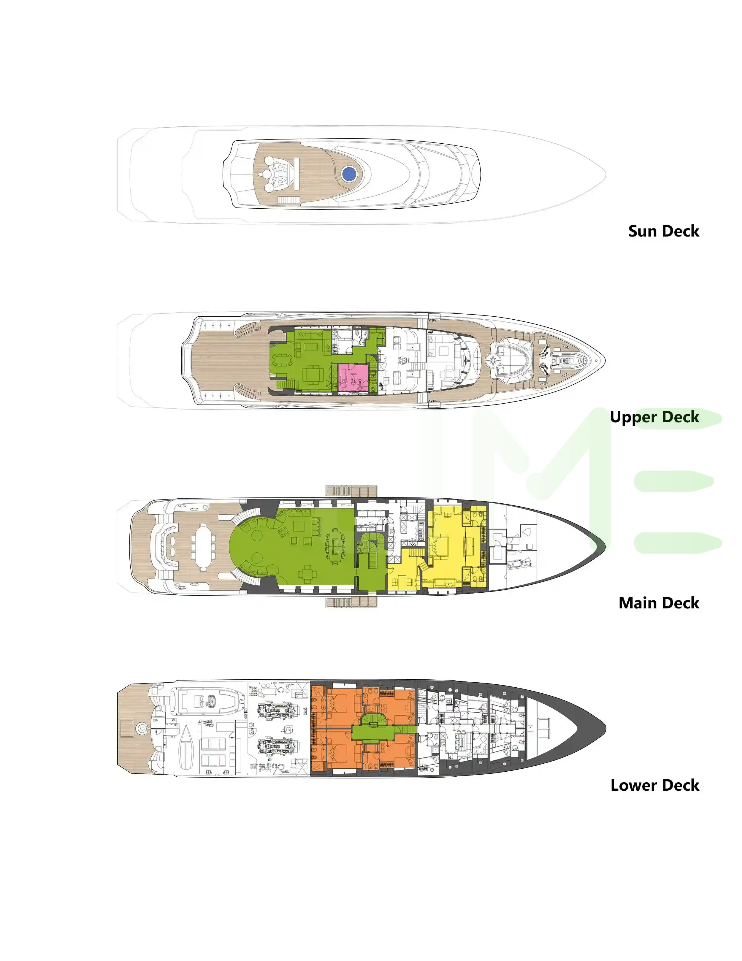 Request plans that include the layout of staterooms, guest areas, and outdoor spaces, as well as crew quarters and work areas.