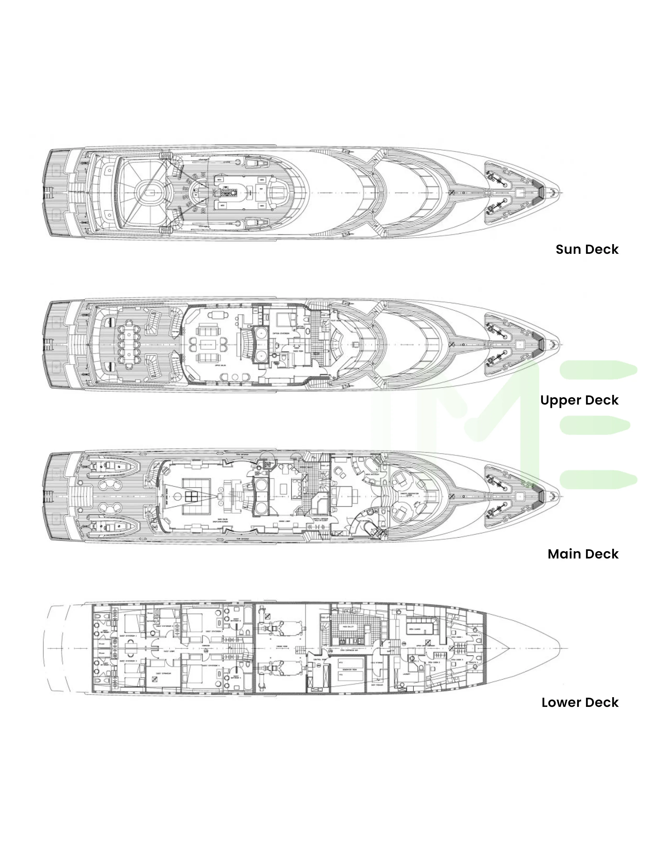 Request plans that include the layout of staterooms, guest areas, and outdoor spaces, as well as crew quarters and work areas.