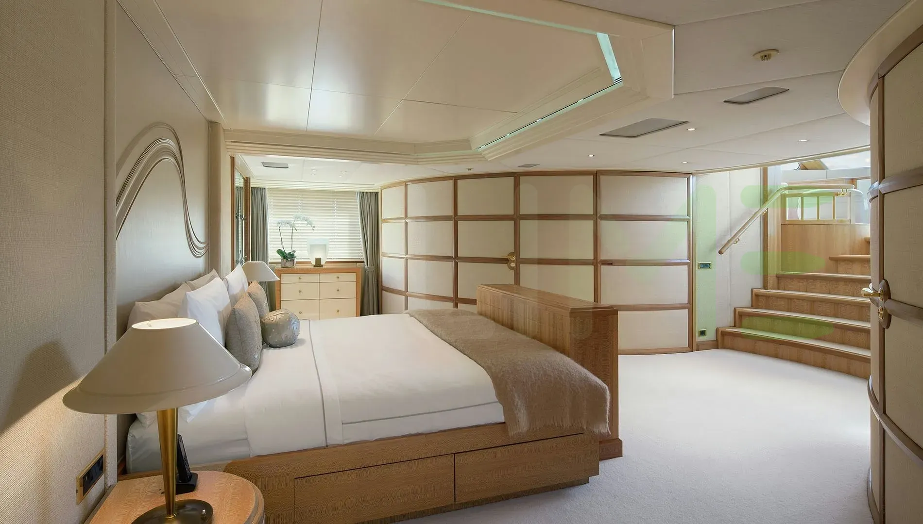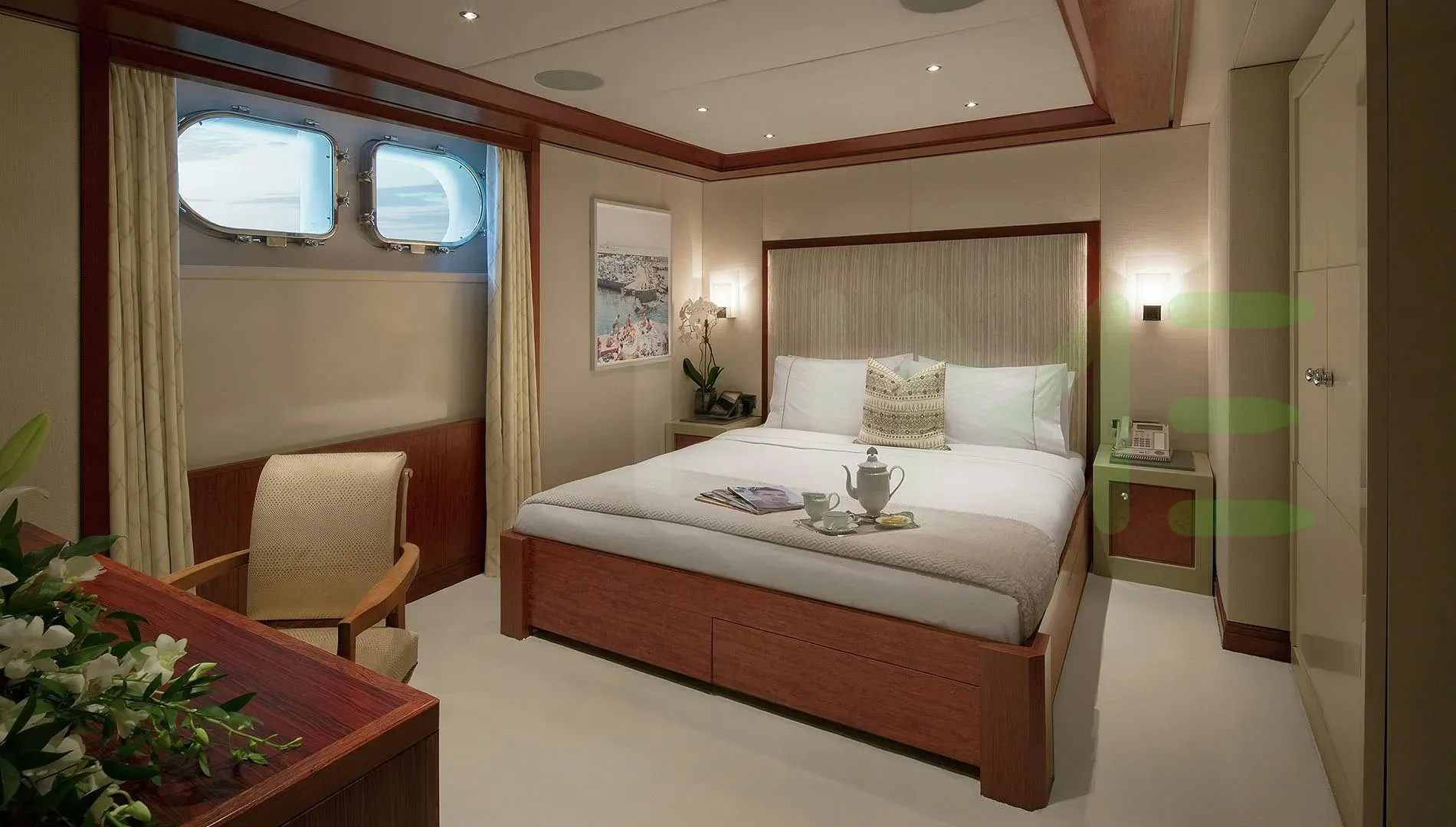 With a gross tonnage of 638, the AO yacht for charter provides ample interior space for enjoyment. AO offers accommodations for up to 14 guests in 6 lavishly appointed staterooms. She can also carry up to 12 crew onboard, including the Captain, to ensure a relaxed luxury yacht charter experience. The interior design by The A Group, Baron Gurney Interiors exudes a sense of luxury, seamlessly blending comfort with style.
