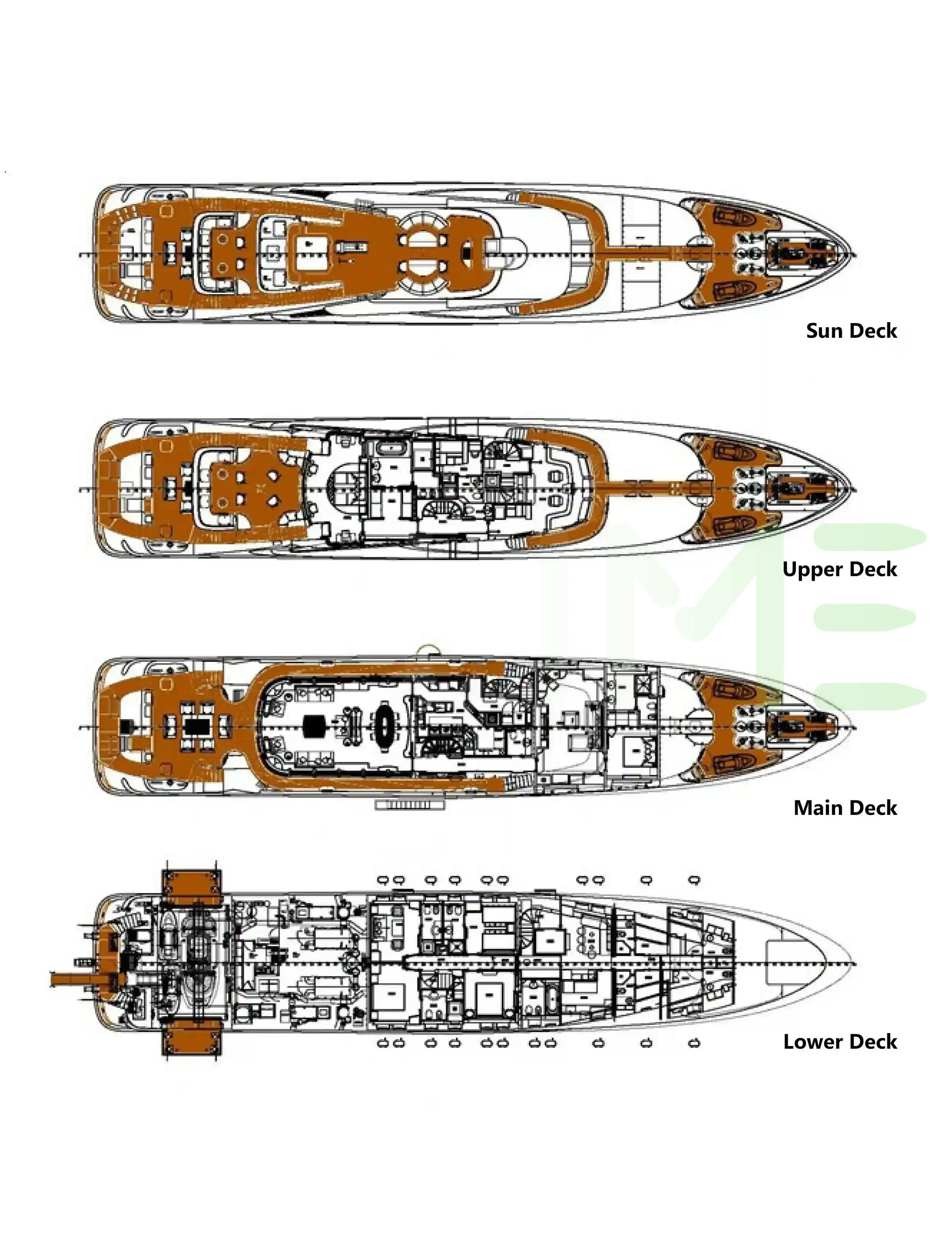 Request plans that include the layout of staterooms, guest areas, and outdoor spaces, as well as crew quarters and work areas.