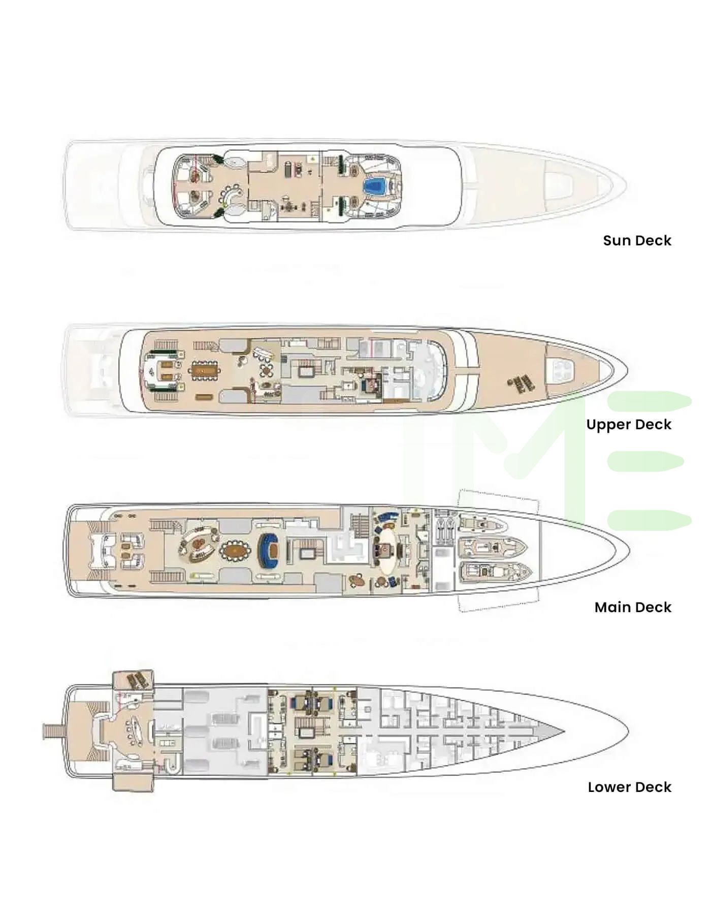 Request plans which include the layout of staterooms, guest areas, and outdoor spaces, as well as crew quarters and working spaces.