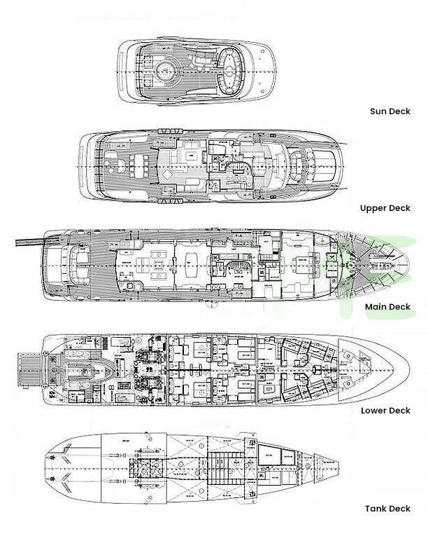 Request plans that include the layout of staterooms, guest areas, and outdoor spaces, as well as crew quarters and work areas.