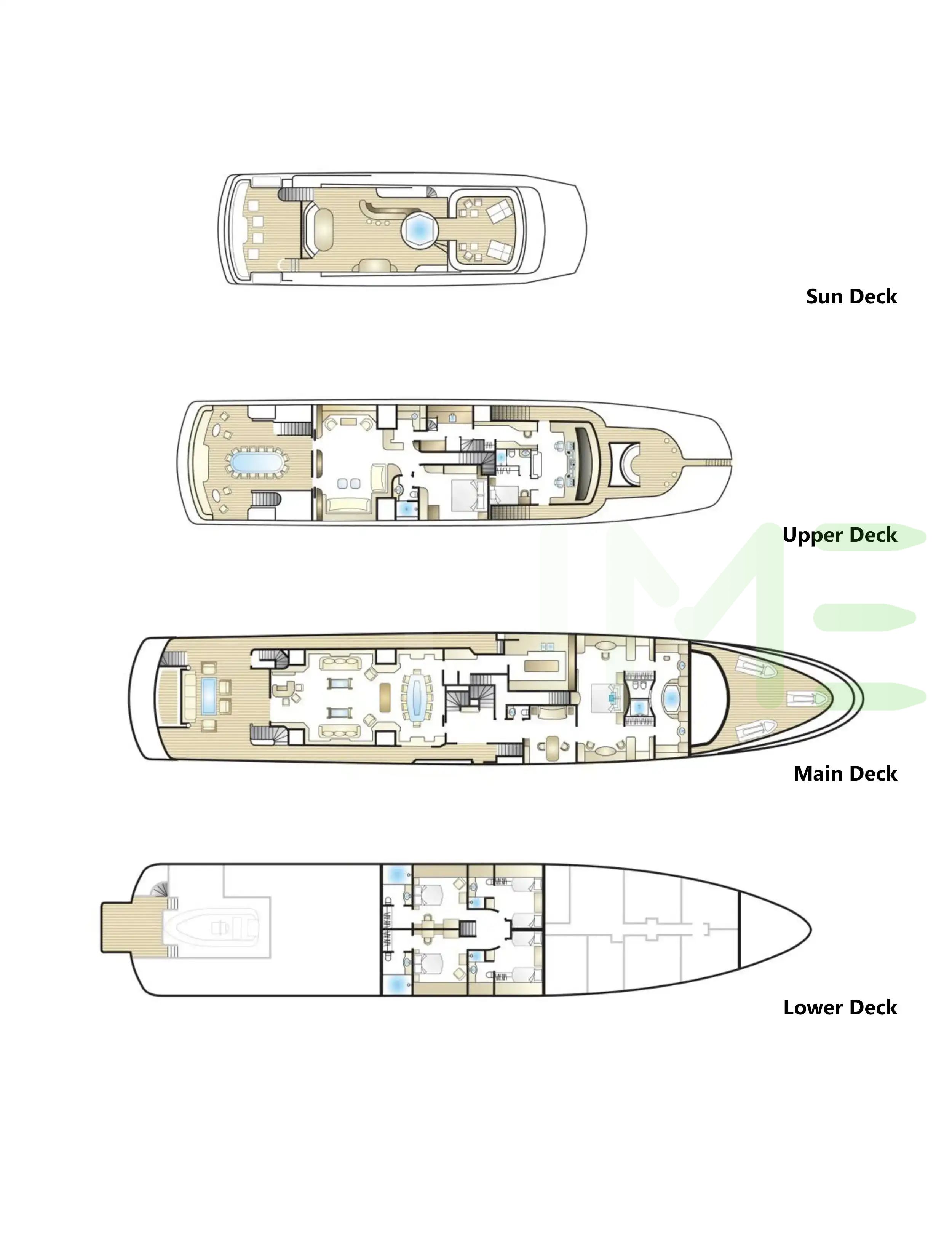 Request plans that include the layout of staterooms, guest areas, and outdoor spaces, as well as crew quarters and work areas.