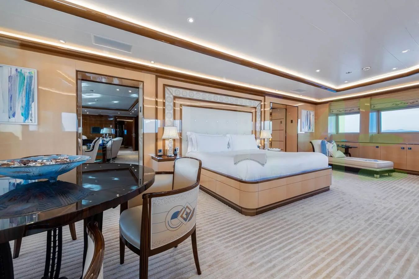 With a gross tonnage of 2,310, the BATELLO yacht for charter provides ample interior space for enjoyment. BATELLO offers accommodations for up to 16 guests in 9 lavishly appointed staterooms. She can also carry up to 26 crew onboard, including the Captain, to ensure a relaxed luxury yacht charter experience. The interior design by Alberto Pinto exudes a sense of luxury, seamlessly blending comfort with style.