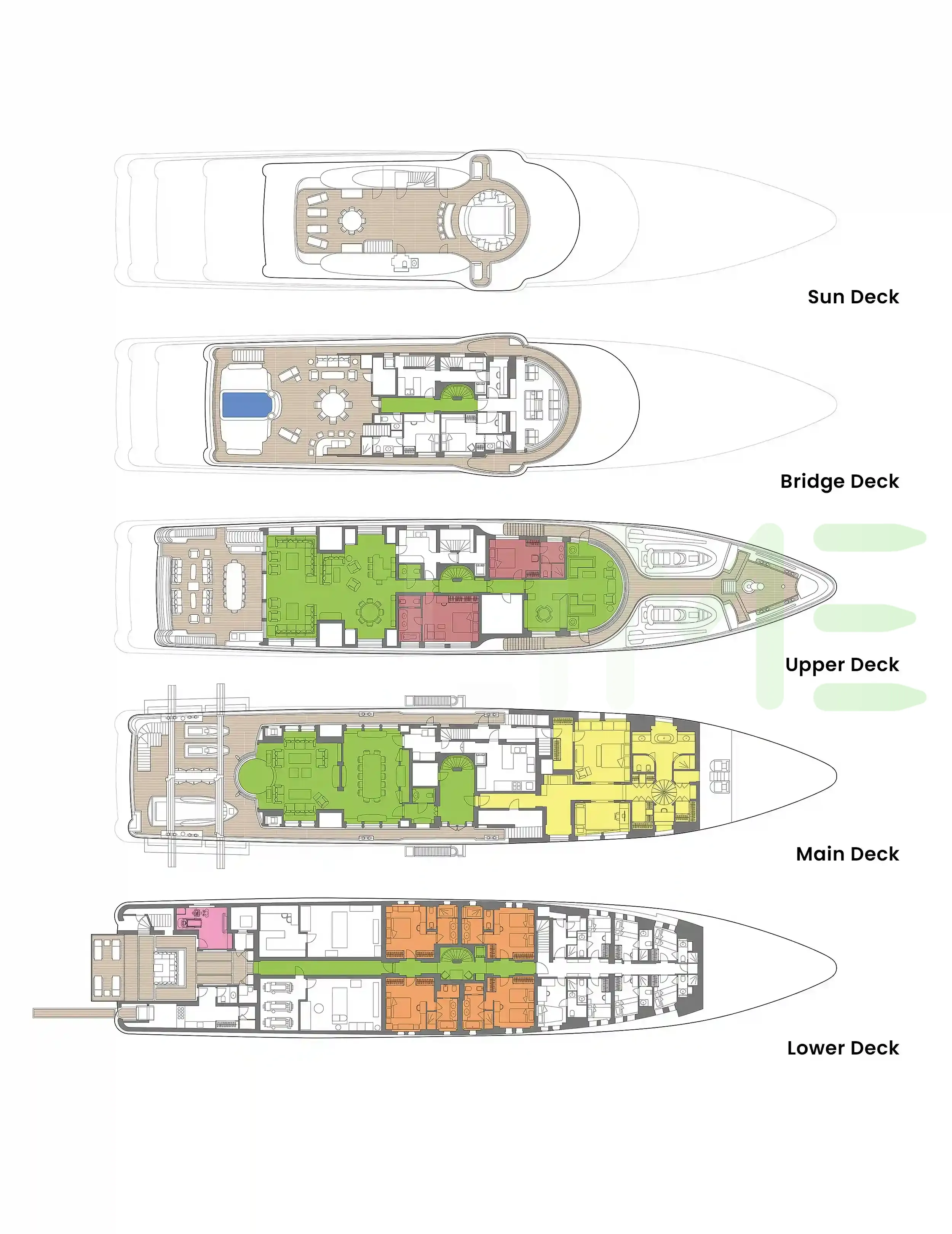 Request plans that include the layout of staterooms, guest areas, and outdoor spaces, as well as crew quarters and work areas.