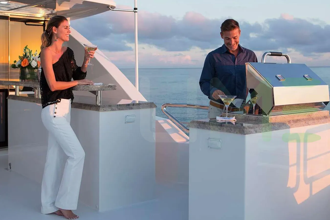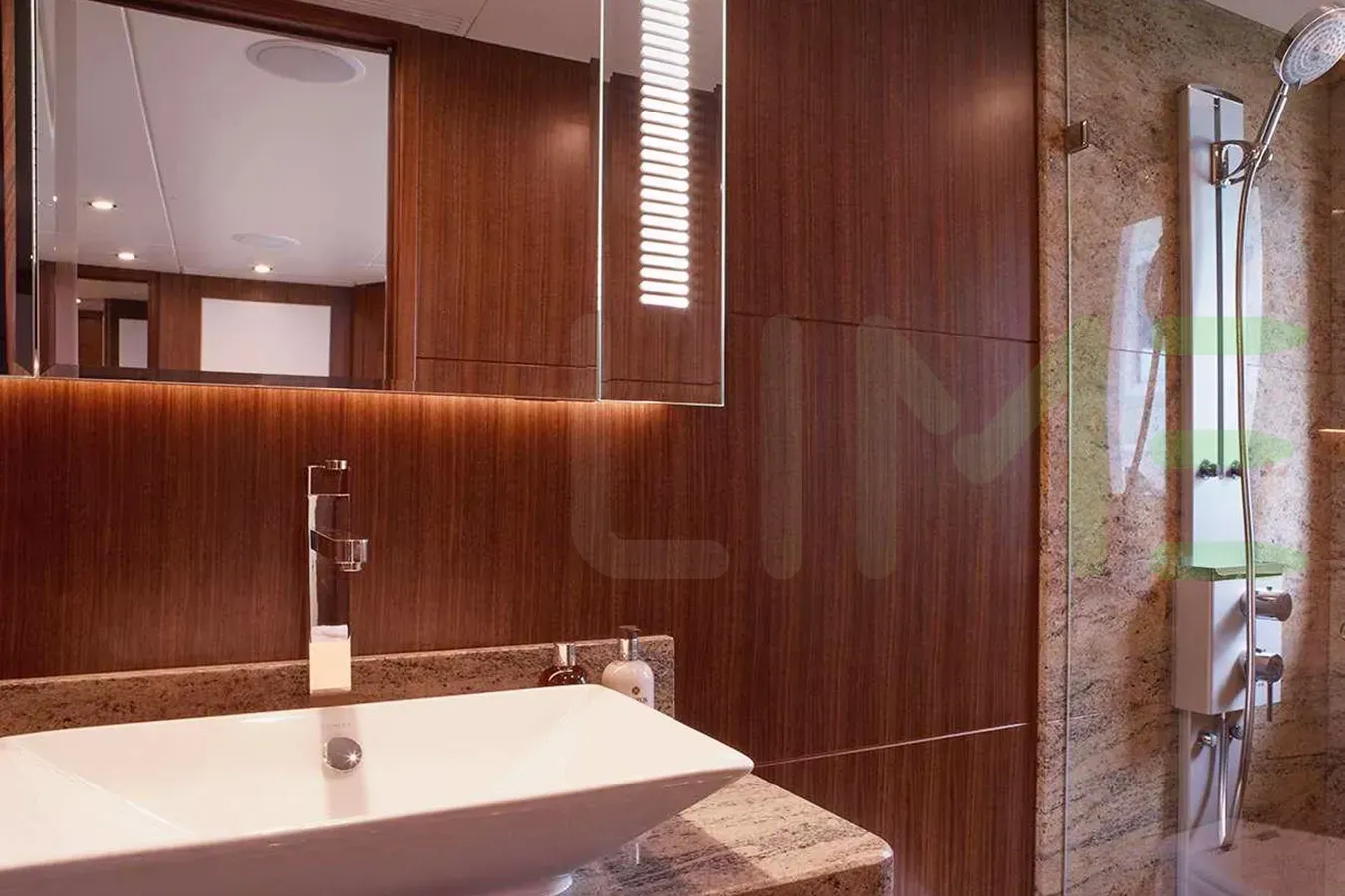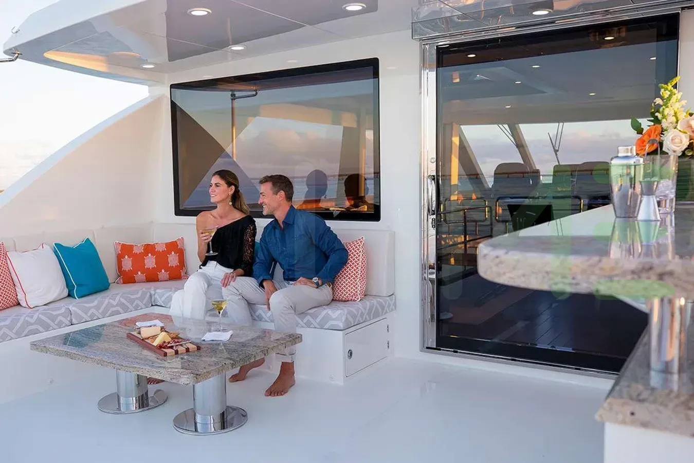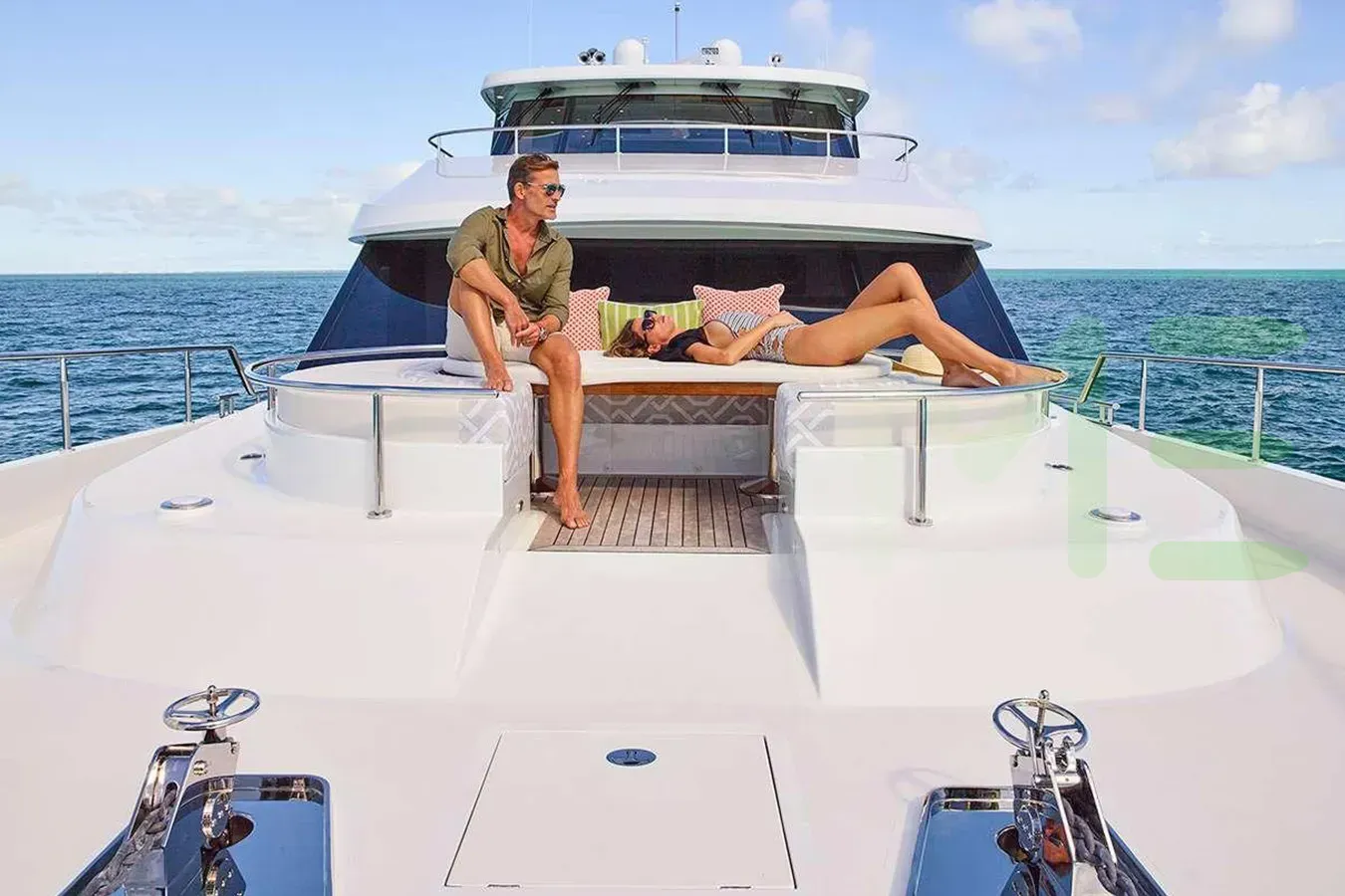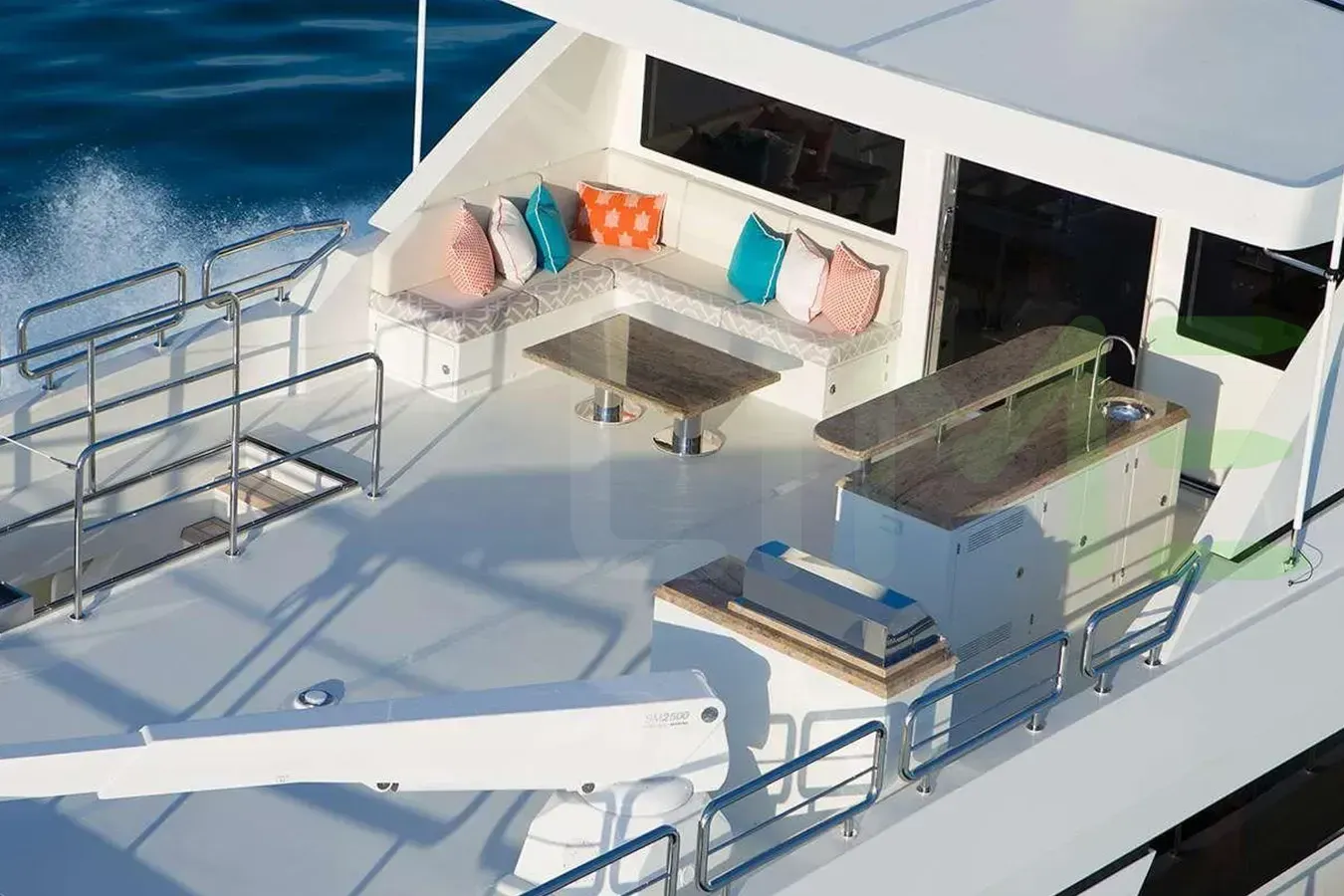 The exterior, designed by Evan K Marshall, captures your attention with beautiful lines and impeccable craftsmanship. Whether you're lounging on the spacious decks or enjoying water sports in a secluded anchorage, the BELLA LISA yacht for charter, built of GRP, offers a wealth of opportunities for relaxation and adventure.