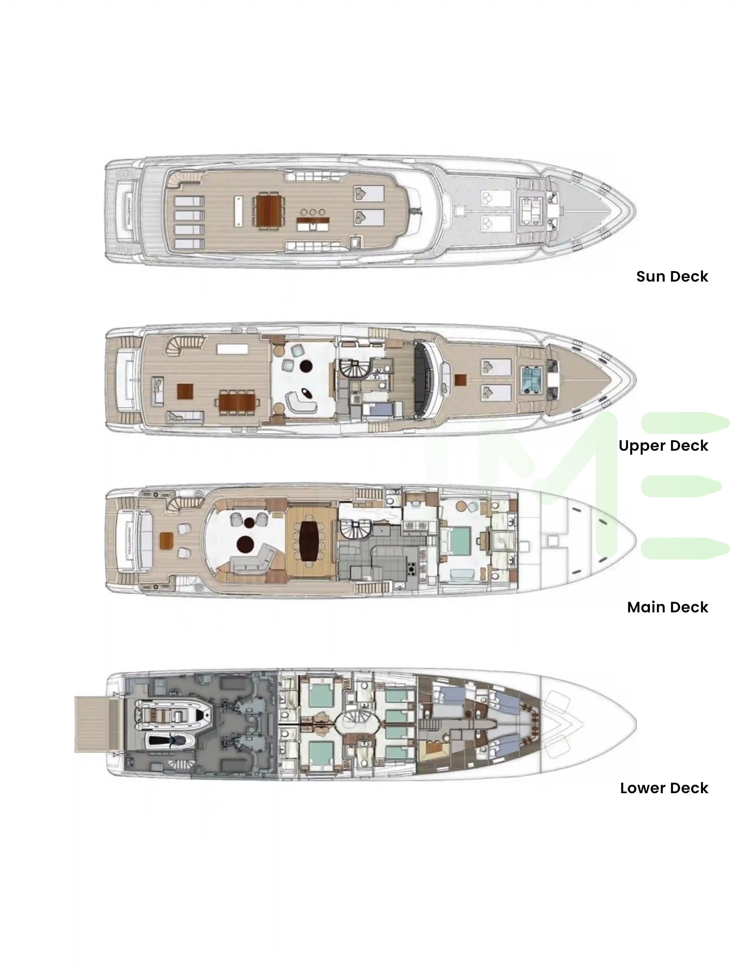 Request plans that include the layout of staterooms, guest areas, and outdoor spaces, as well as crew quarters and work areas.