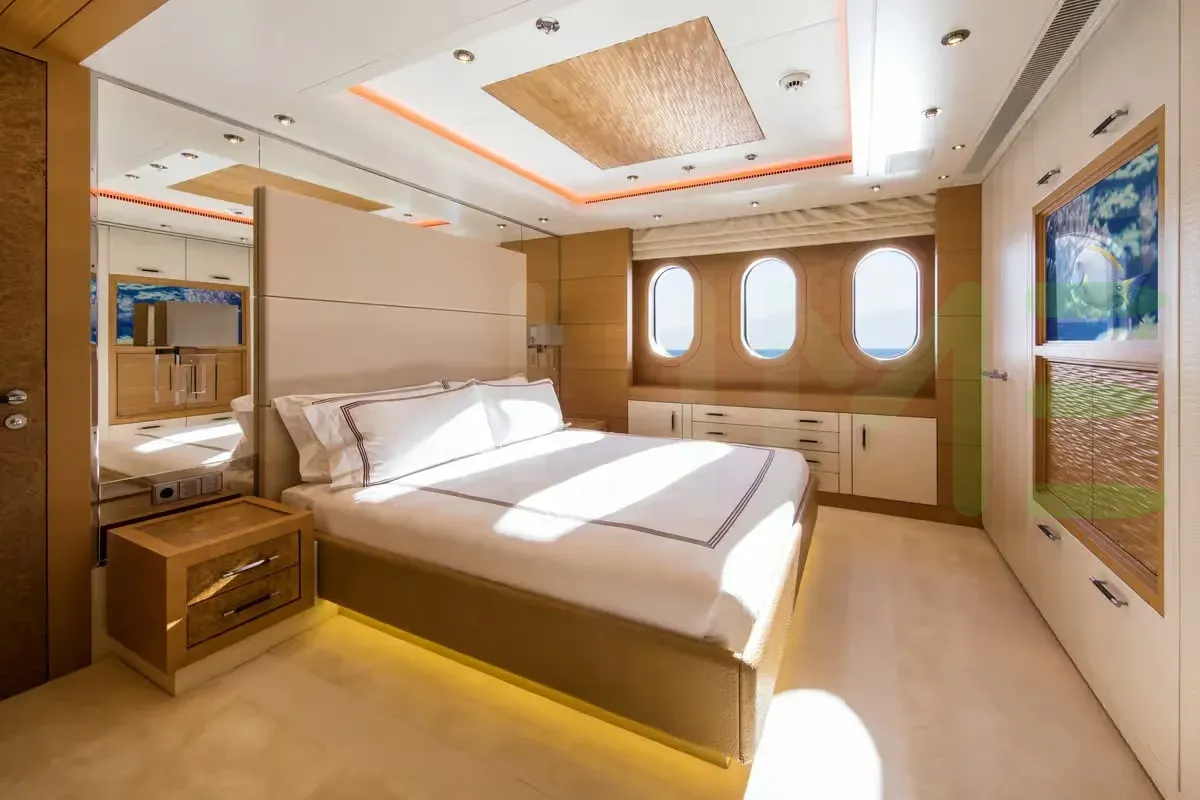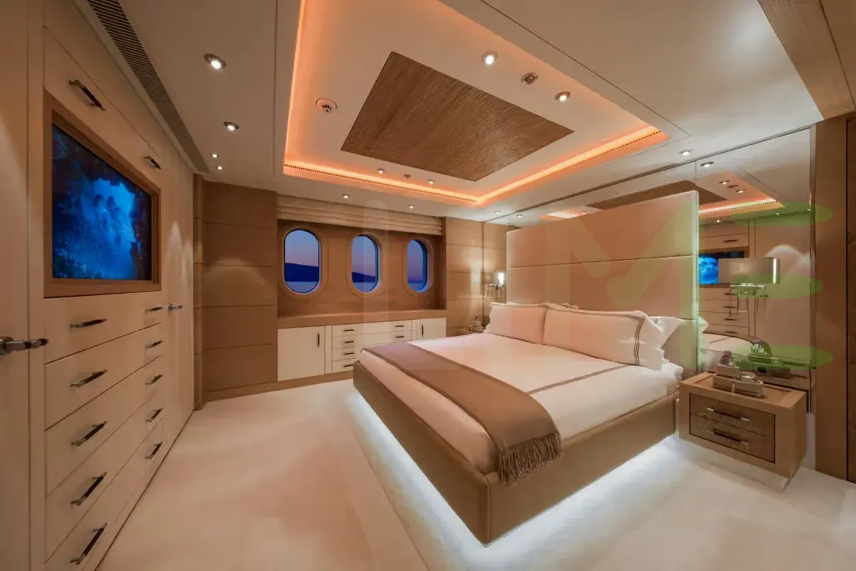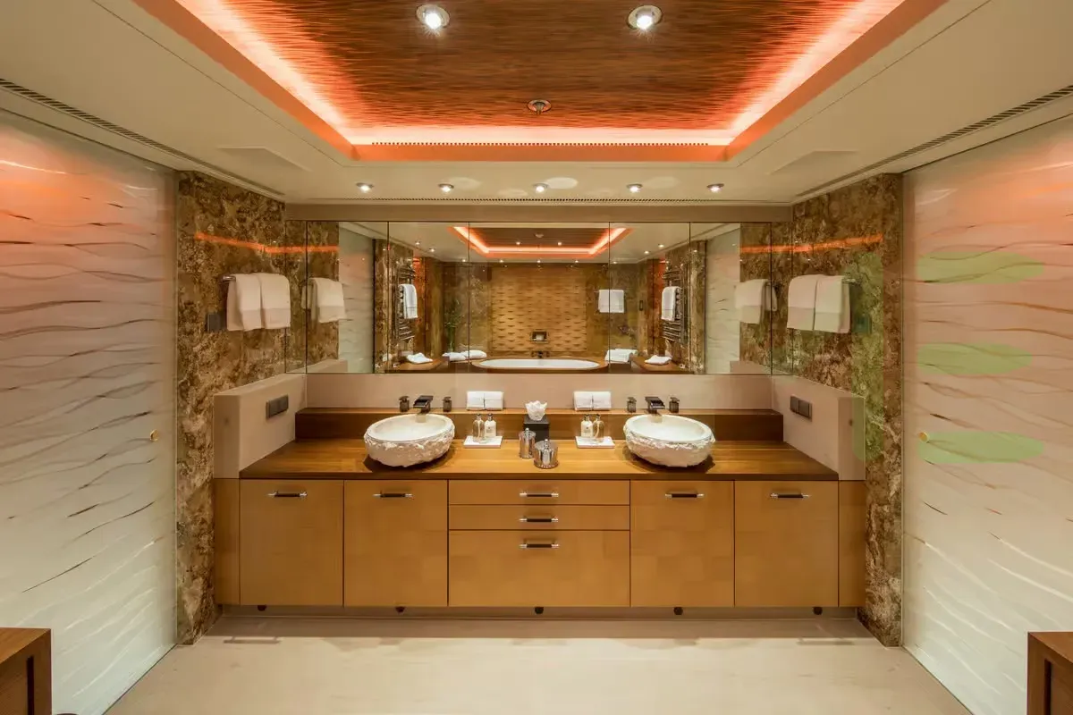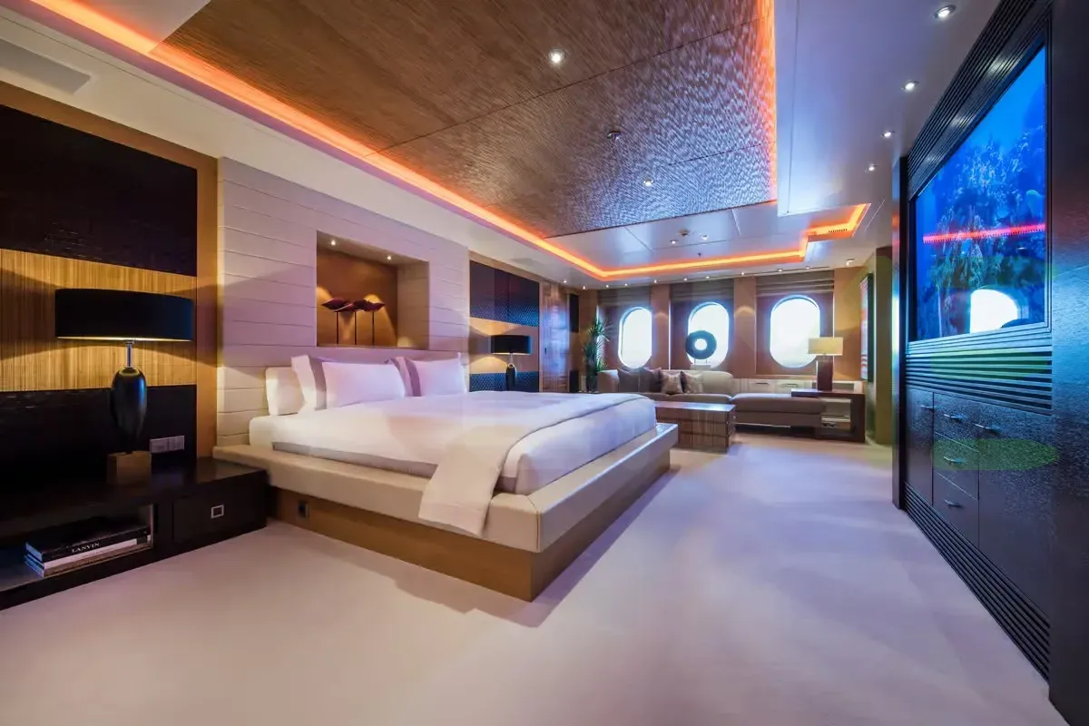 With a gross tonnage of 1,182, the CAIPIRINHA yacht for charter provides ample interior space for enjoyment. CAIPIRINHA offers accommodations for up to 12 guests in 6 lavishly appointed staterooms. She can also carry up to 14 crew onboard, including the Captain, to ensure a relaxed luxury yacht charter experience. The interior design by Mark Berryman Design Ltd exudes a sense of luxury, seamlessly blending comfort with style.