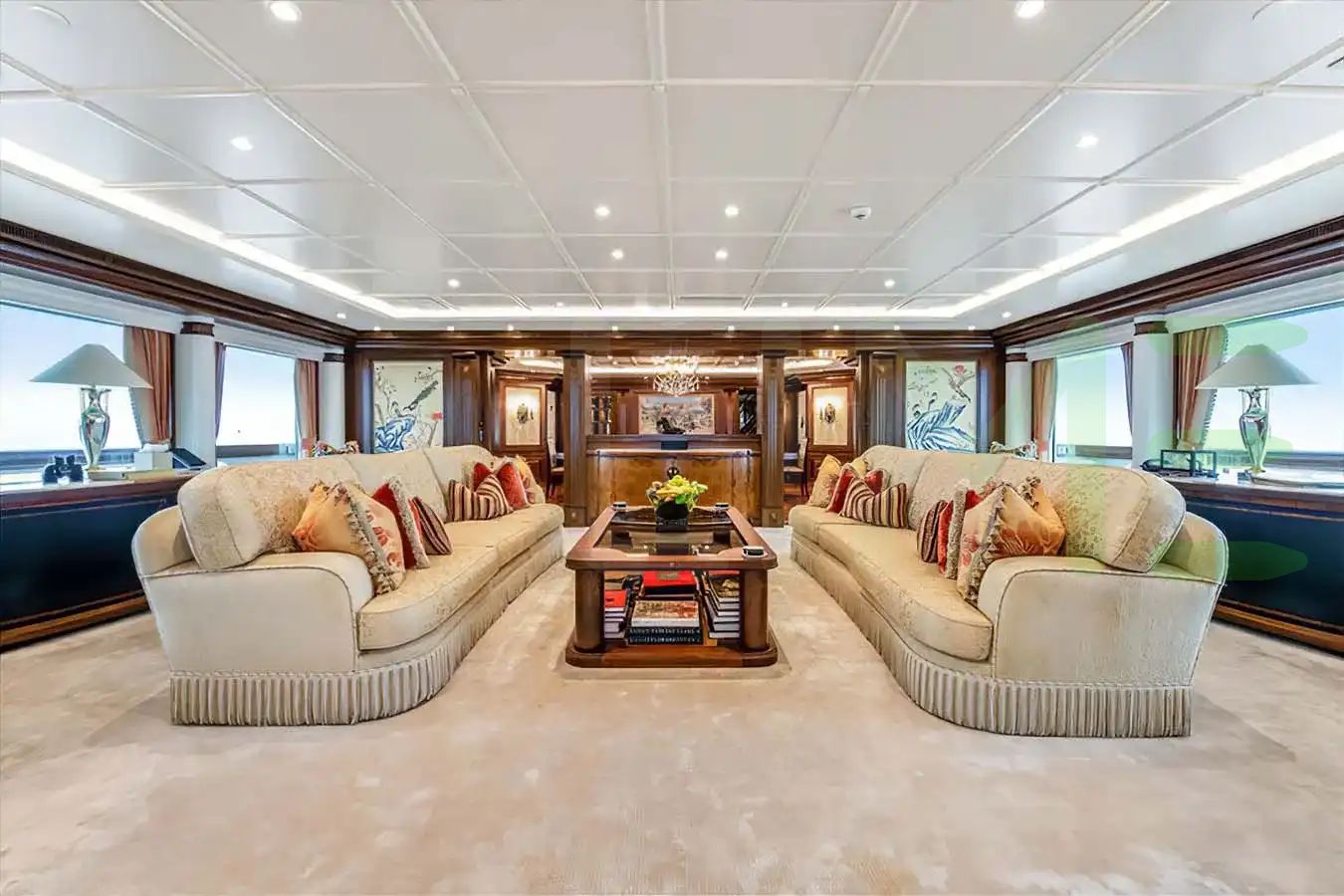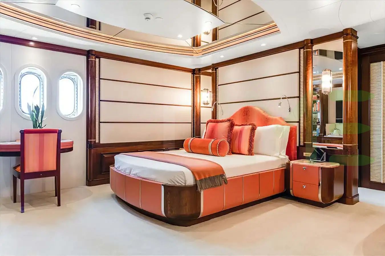 With a gross tonnage of 1,149, the CALYPSO yacht for charter provides ample interior space for enjoyment. CALYPSO offers accommodations for up to 12 guests in 7 lavishly appointed staterooms. She can also carry up to 15 crew onboard, including the Captain, to ensure a relaxed luxury yacht charter experience. The interior design by Michael Leach Design Ltd., Rodriguez Interiors exudes a sense of luxury, seamlessly blending comfort with style.