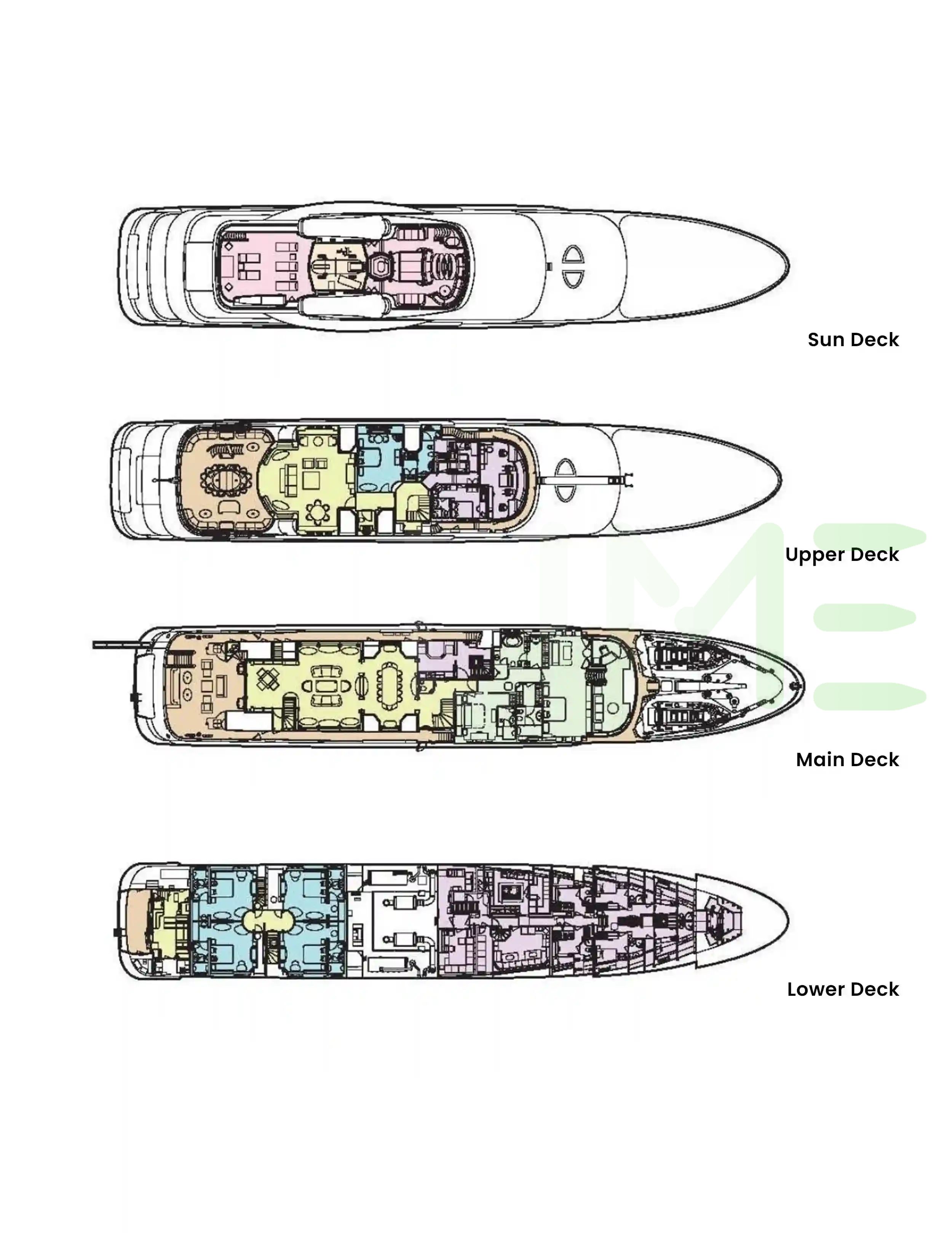 Request plans that include the layout of staterooms, guest areas, and outdoor spaces, as well as crew quarters and work areas.