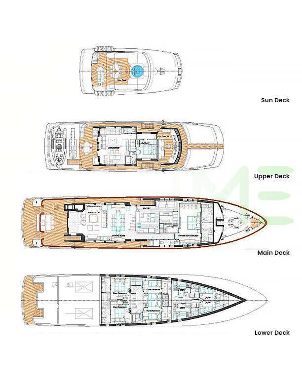 Request plans that include the layout of staterooms, guest areas, and outdoor spaces, as well as crew quarters and work areas.