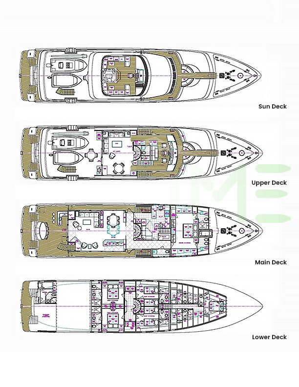 Request plans that include the layout of staterooms, guest areas, and outdoor spaces, as well as crew quarters and work areas.
