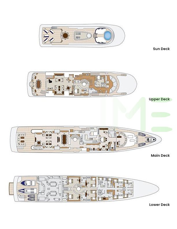 Request plans that include the layout of staterooms, guest areas, and outdoor spaces, as well as crew quarters and work areas.