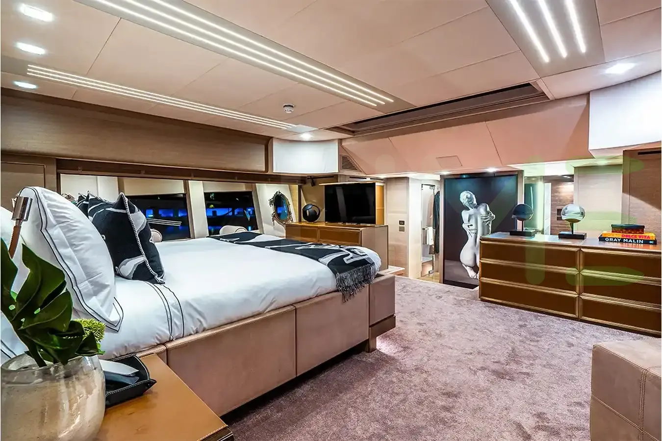 Built by Monte Carlo in Italy, this stunning yacht boasts a length of 105' 10" (32.26m), a beam of 23' 5" (7.14m), and a draft of 7' 4" (2.23m).