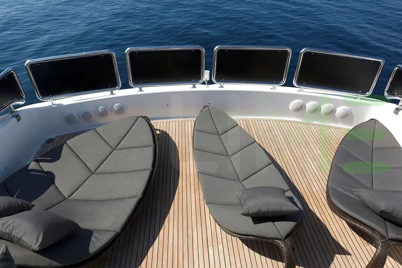 The exterior, designed by Horizon Yachts, captures your attention with beautiful lines and impeccable craftsmanship. Whether you're lounging on the spacious decks or enjoying water sports in a secluded anchorage, the CONTE ALBERTI yacht for charter, built of GRP, offers a wealth of opportunities for relaxation and adventure.