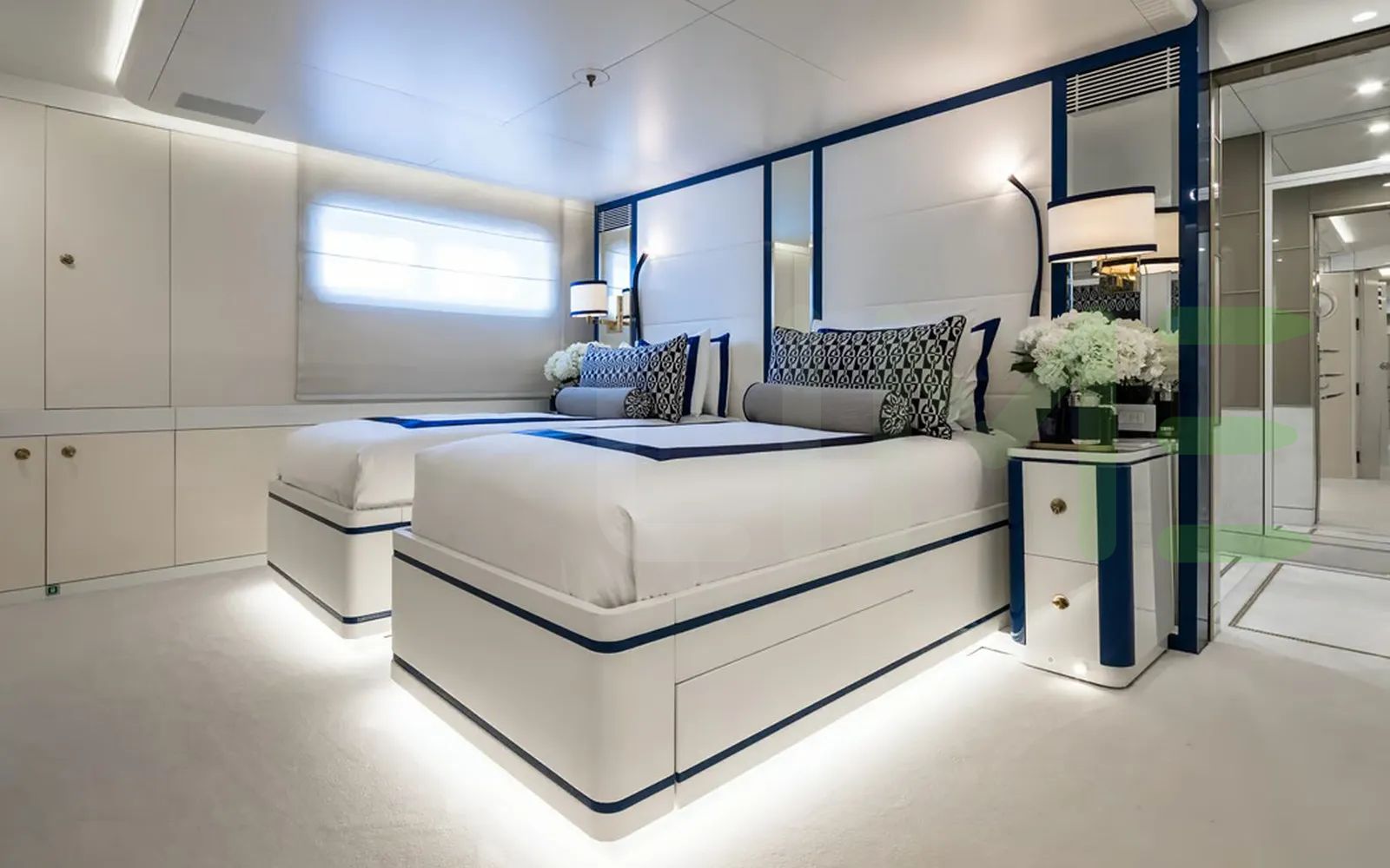 With a gross tonnage of 1,526, the CORAL OCEAN yacht for charter provides ample interior space for enjoyment. CORAL OCEAN offers accommodations for up to 12 guests in 7 lavishly appointed staterooms. She can also carry up to 22 crew onboard, including the Captain, to ensure a relaxed luxury yacht charter experience. The interior design by Jon Bannenberg Ltd exudes a sense of luxury, seamlessly blending comfort with style.