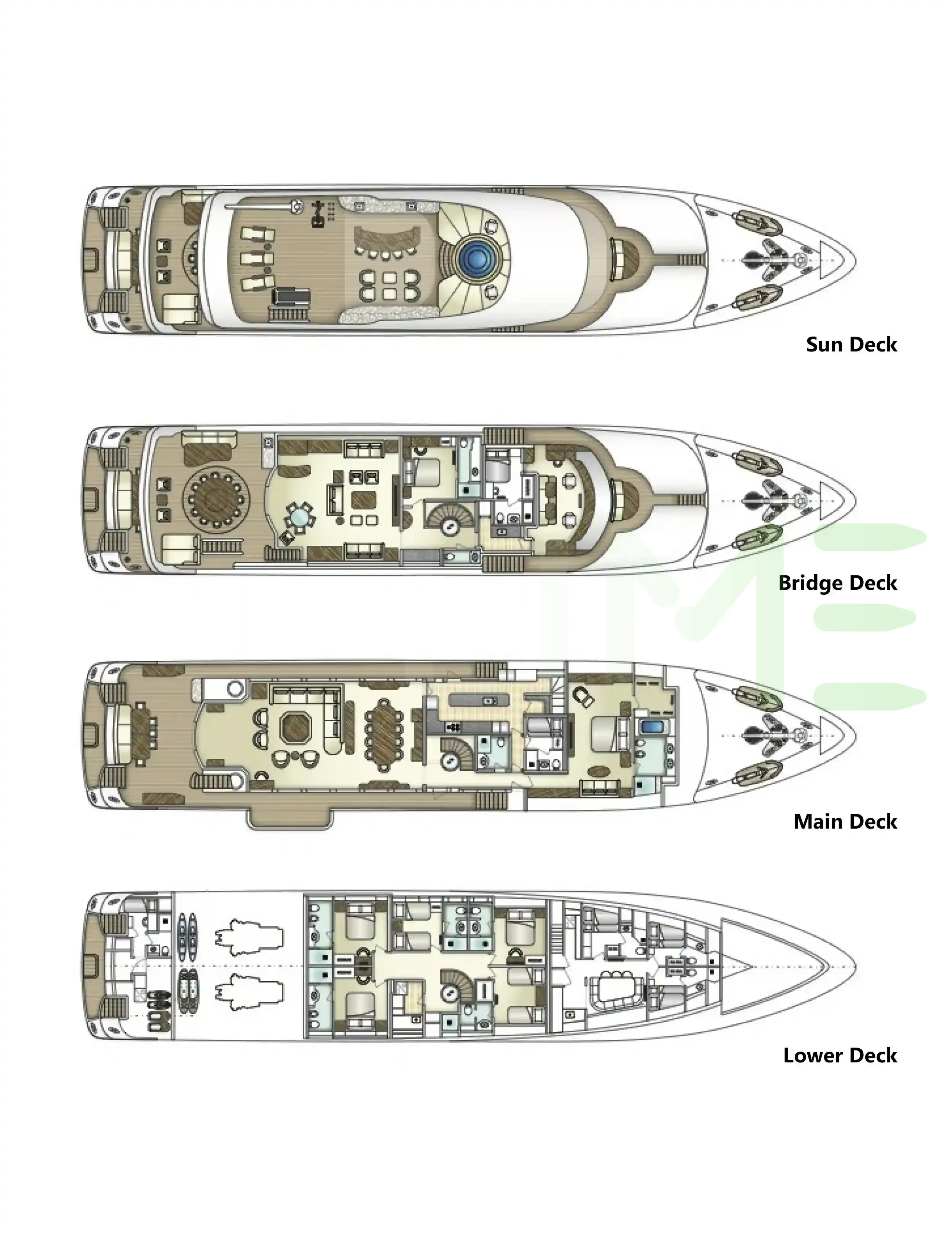 Request plans that include the layout of staterooms, guest areas, and outdoor spaces, as well as crew quarters and work areas.