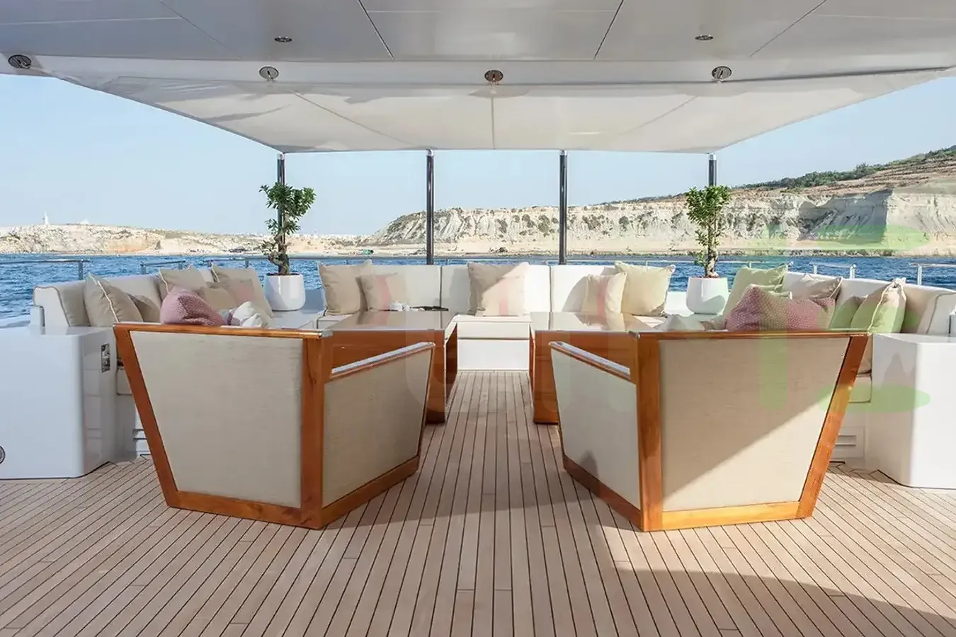 The exterior, designed by Omega Architects, captures your attention with beautiful lines and impeccable craftsmanship. Whether you're lounging on the spacious decks or enjoying water sports in a secluded anchorage, the DAISY D yacht for charter, built of Aluminium, offers a wealth of opportunities for relaxation and adventure.