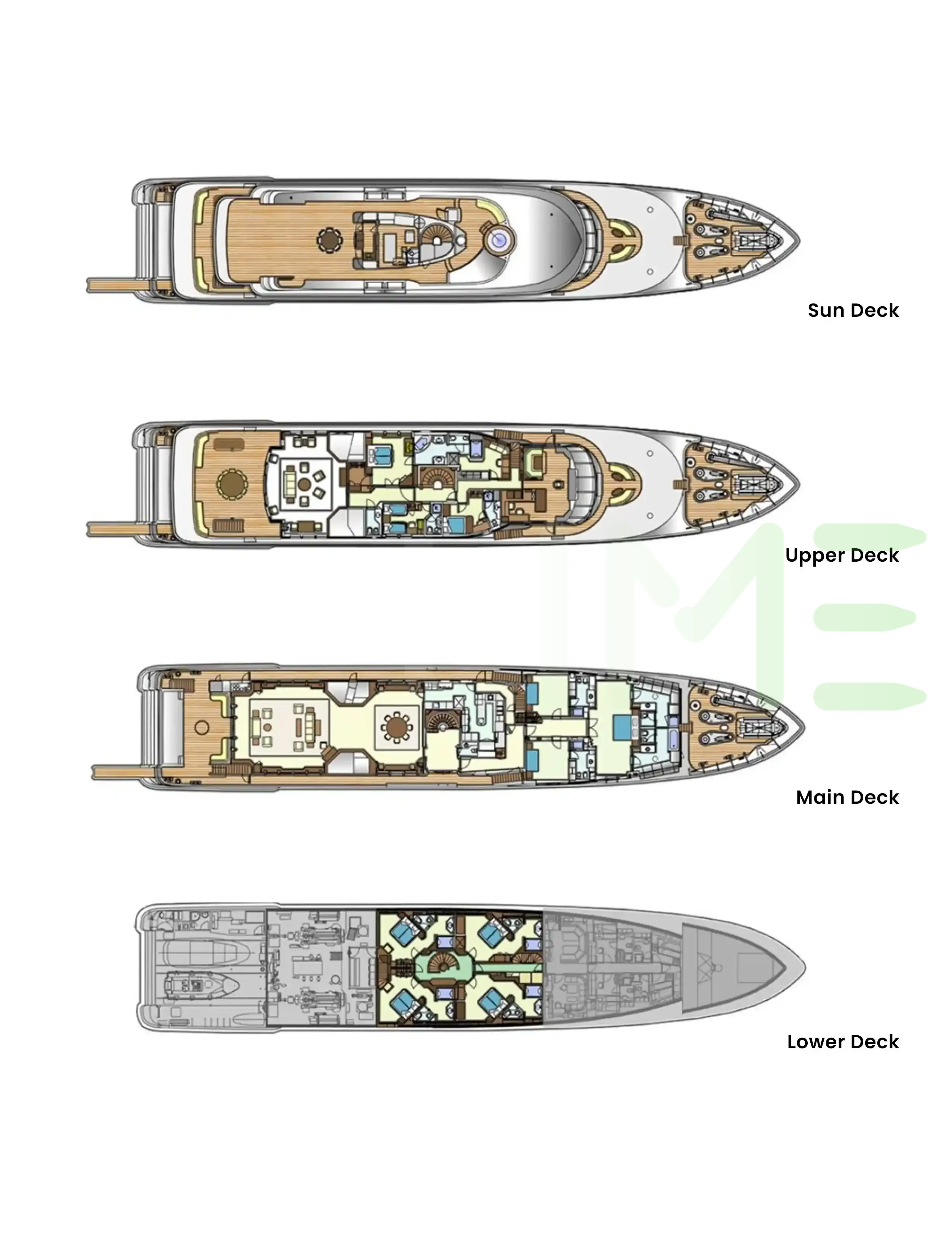Request plans that include the layout of staterooms, guest areas, and outdoor spaces, as well as crew quarters and work areas.