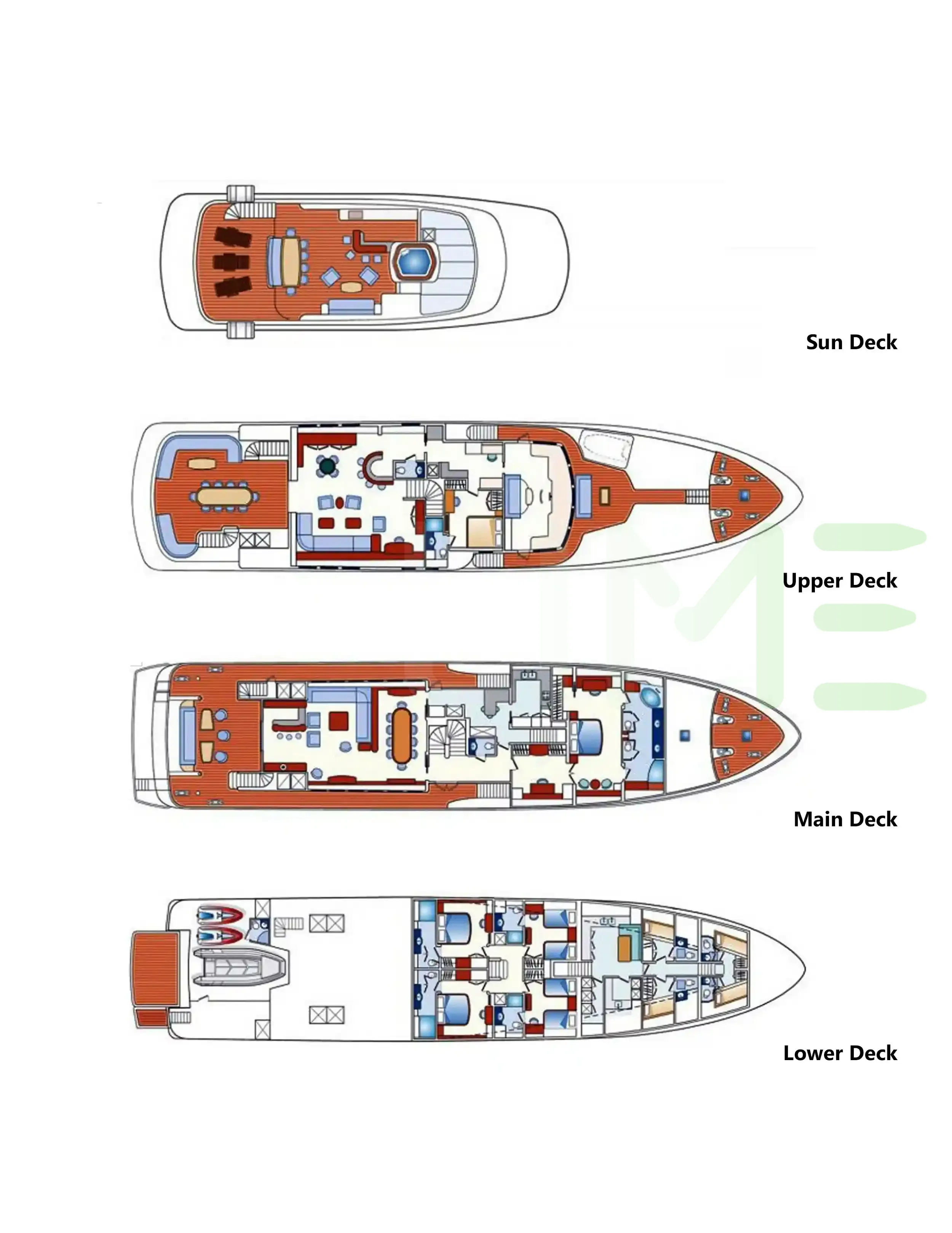 Request plans that include the layout of staterooms, guest areas, and outdoor spaces, as well as crew quarters and work areas.