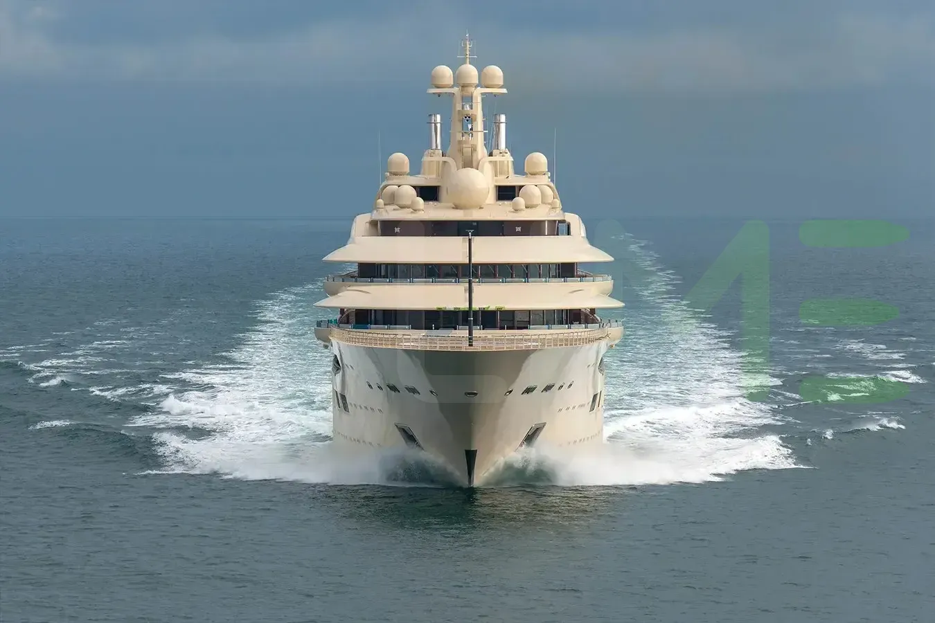 Her features include separate crew passageway, spa, beauty salon, elevator, underwater lights, gym and air conditioning.