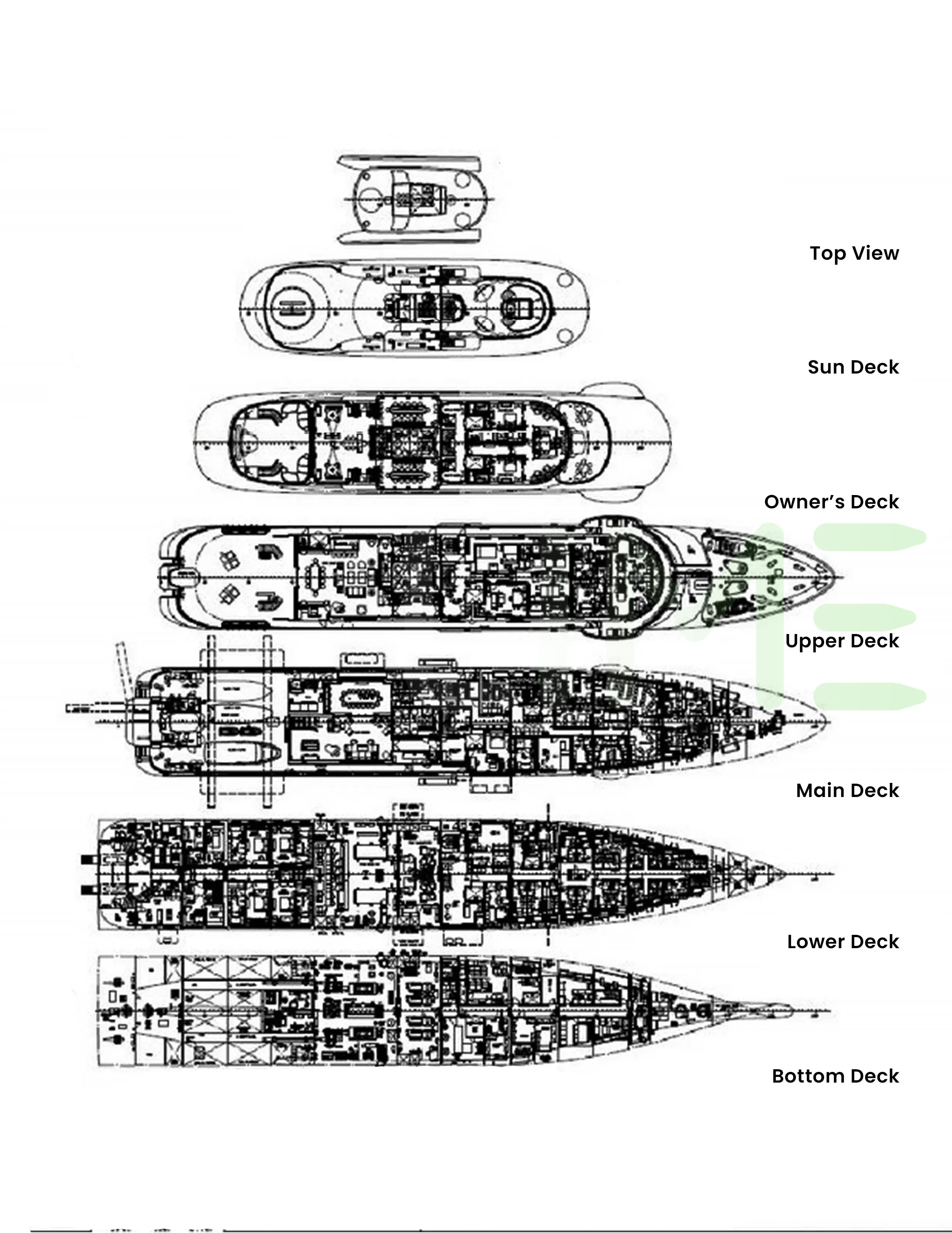 Request plans that include the layout of staterooms, guest areas, and outdoor spaces, as well as crew quarters and work areas.