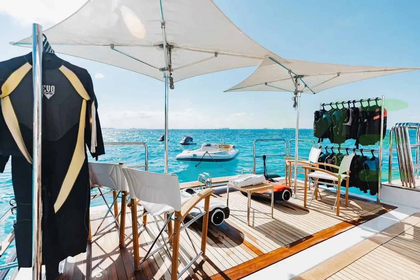 Indulge in the opulent comforts of spacious lounges, gourmet dining areas, and elegantly appointed staterooms. Savor the breathtaking views from the open decks, unwind on a sun lounge, or stay active in the water. For adventure enthusiasts, the DOMANI motoryacht is equipped with an array of water toys. Dive into the crystal-clear waters for a refreshing swim, explore hidden coves, or experience the thrill of wakeboarding. With attentive crew members catering to your every need, a yacht charter promises an unforgettable blend of relaxation, luxury, and adventure.