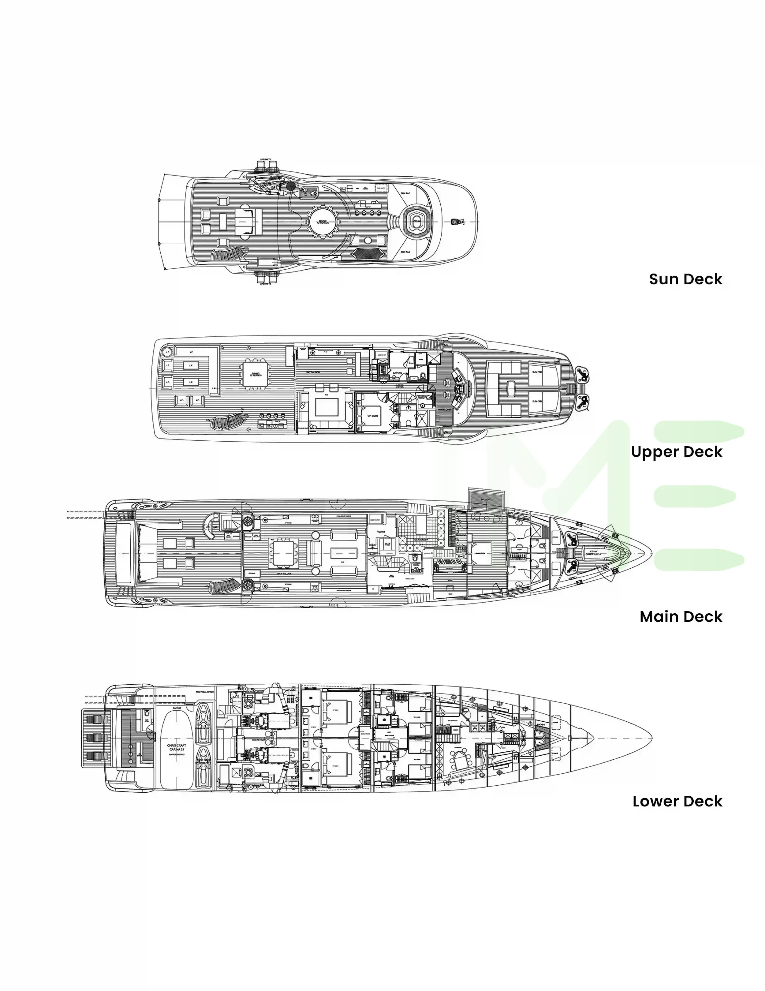 Request plans that include the layout of staterooms, guest areas, and outdoor spaces, as well as crew quarters and work areas.