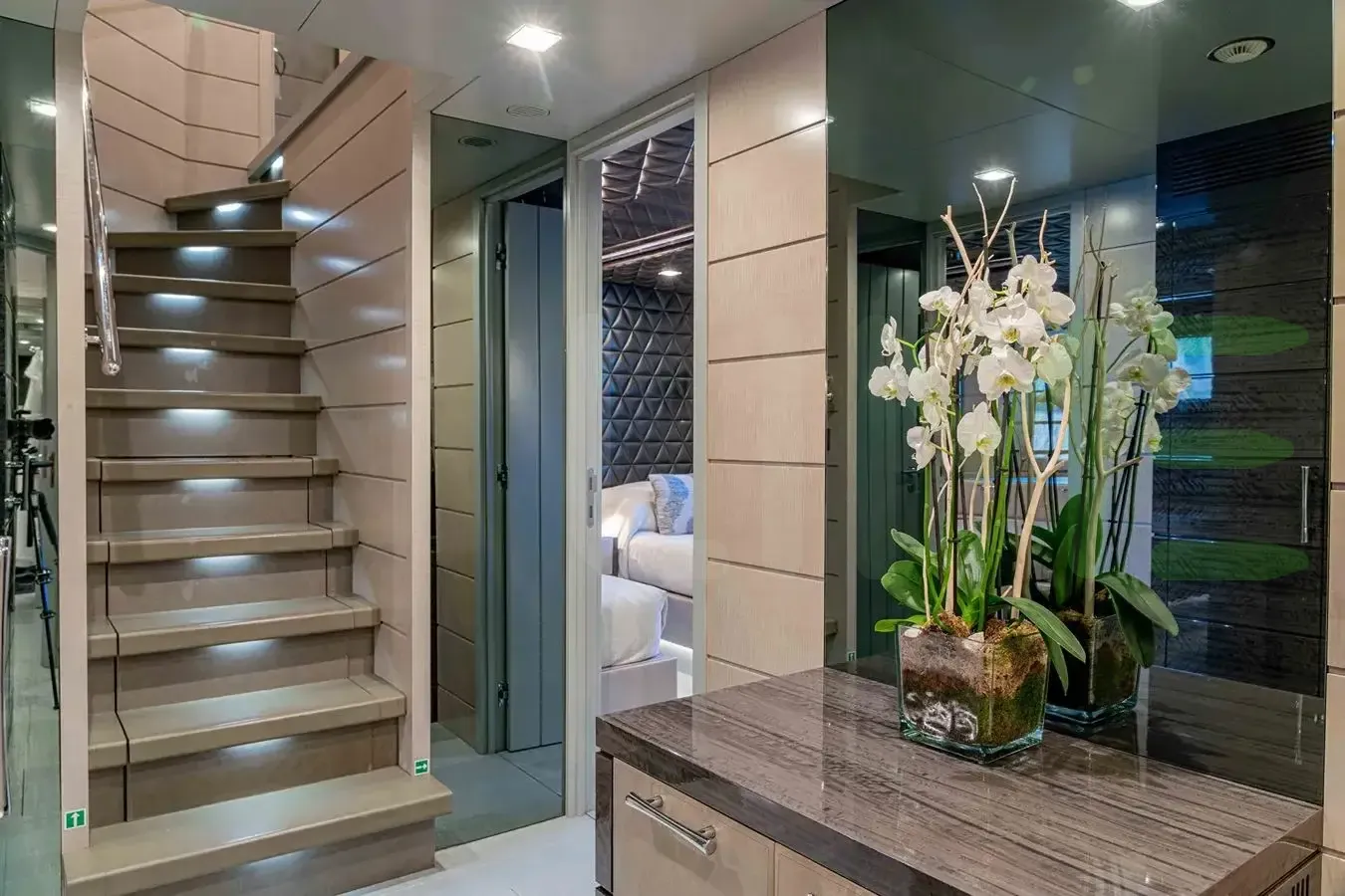 With a gross tonnage of 298, the EDESIA yacht for charter provides ample interior space for enjoyment. EDESIA offers accommodations for up to 12 guests in 5 lavishly appointed staterooms. She can also carry up to 7 crew onboard, including the Captain, to ensure a relaxed luxury yacht charter experience. The interior design by Zuretti Interior Design exudes a sense of luxury, seamlessly blending comfort with style.