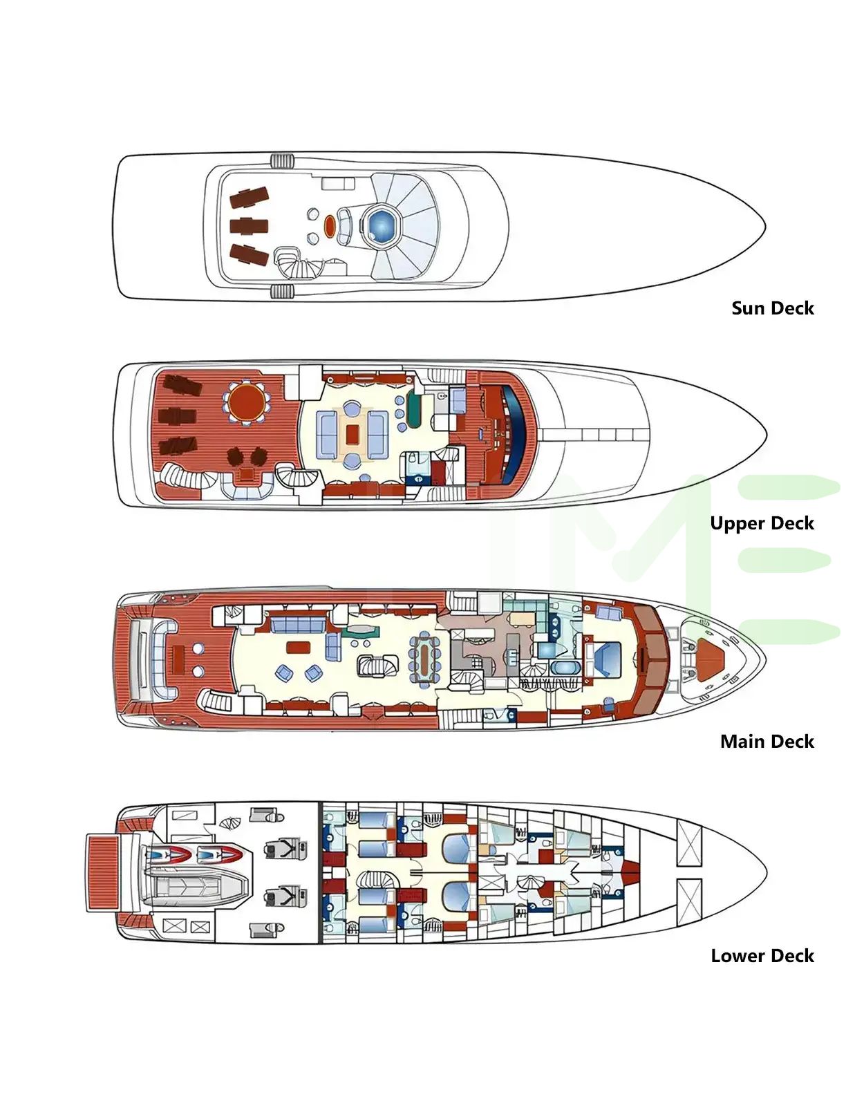 Request plans that include the layout of staterooms, guest areas, and outdoor spaces, as well as crew quarters and work areas.