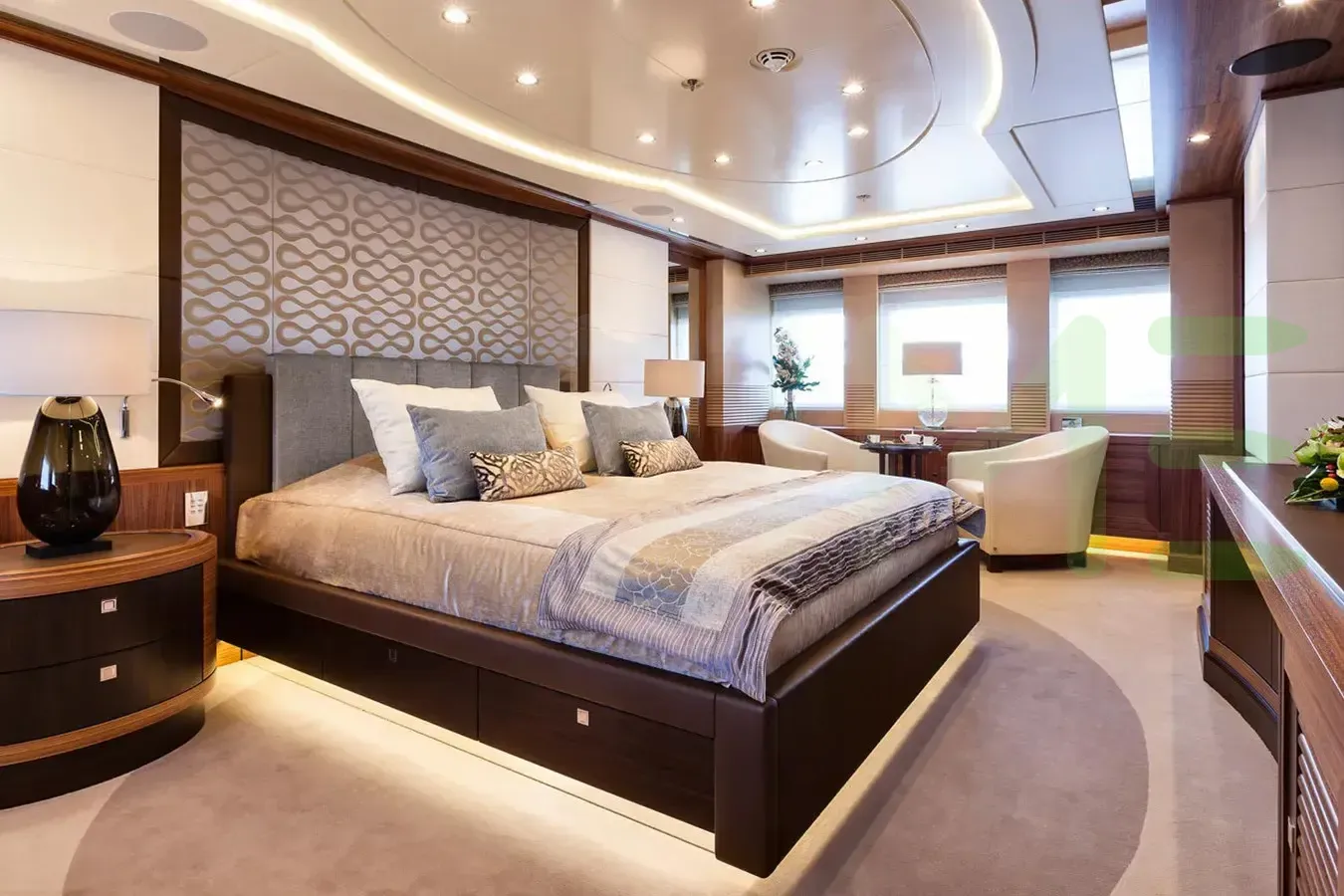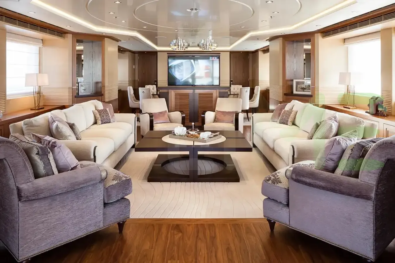 With a gross tonnage of 499, the ELENA yacht for charter provides ample interior space for enjoyment. ELENA offers accommodations for up to 10 guests in 5 lavishly appointed staterooms. She can also carry up to 9 crew onboard, including the Captain, to ensure a relaxed luxury yacht charter experience. The interior design by Omega Architects exudes a sense of luxury, seamlessly blending comfort with style.