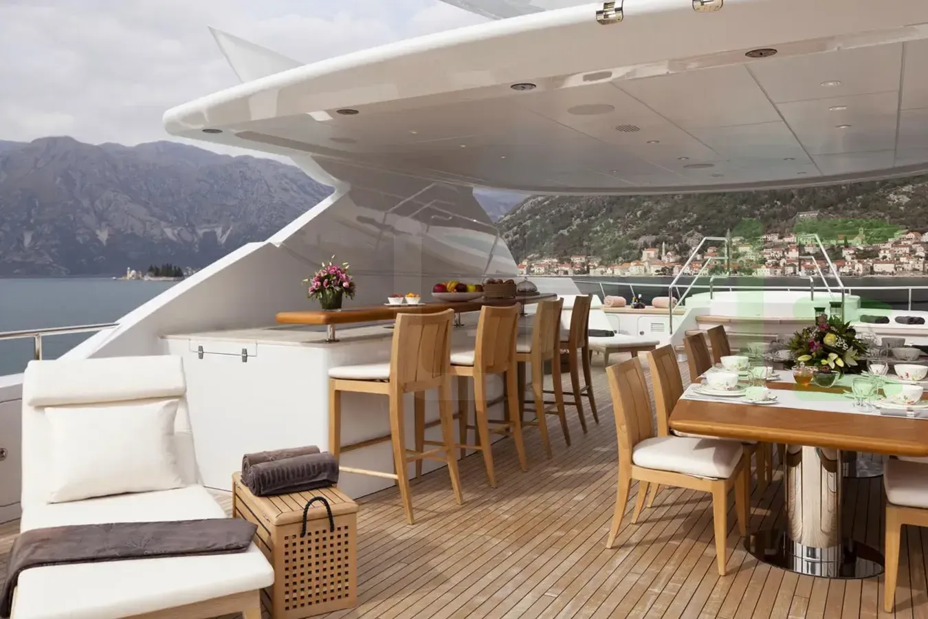 The exterior, designed by Omega Architects, captures your attention with beautiful lines and impeccable craftsmanship. Whether you're lounging on the spacious decks or enjoying water sports in a secluded anchorage, the ELENA yacht for charter, built of Steel and Aluminium, offers a wealth of opportunities for relaxation and adventure.
