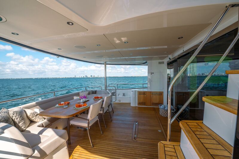 With a gross tonnage of 101, the EOS yacht for charter provides ample interior space for enjoyment. EOS offers accommodations for up to 10 guests in 5 lavishly appointed staterooms. She can also carry up to 5 crew onboard, including the Captain, to ensure a relaxed luxury yacht charter experience. The interior design by Sunseeker exudes a sense of luxury, seamlessly blending comfort with style.