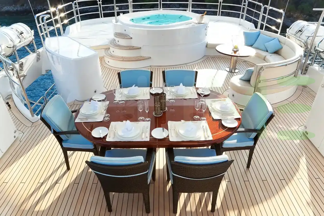 Indulge in the opulent comforts of spacious lounges, gourmet dining areas, and elegantly appointed staterooms. Savor the breathtaking views from the open decks, unwind on a sun lounge, or stay active in the water. For adventure enthusiasts, the EVERBLUE motoryacht is equipped with an array of water toys. Dive into the crystal-clear waters for a refreshing swim, explore hidden coves, or experience the thrill of wakeboarding. With attentive crew members catering to your every need, a yacht charter promises an unforgettable blend of relaxation, luxury, and adventure.