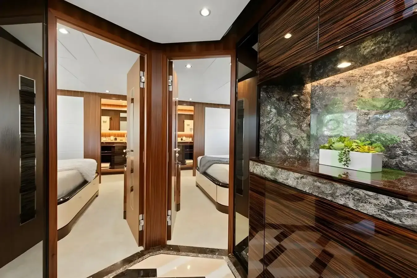 With a gross tonnage of 272, the EVERGLADE yacht for charter provides ample interior space for enjoyment. EVERGLADE offers accommodations for up to 10 guests in 5 lavishly appointed staterooms. She can also carry up to 6 crew onboard, including the Captain, to ensure a relaxed luxury yacht charter experience. The interior design by Evan K Marshall exudes a sense of luxury, seamlessly blending comfort with style.