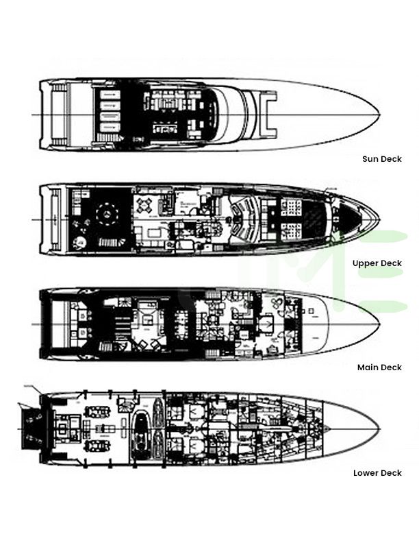 Request plans that include the layout of staterooms, guest areas, and outdoor spaces, as well as crew quarters and work areas.