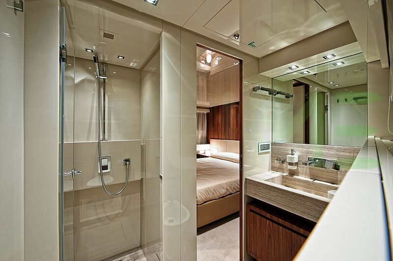The exterior, designed by Sanlorenzo, captures your attention with beautiful lines and impeccable craftsmanship. Whether you're lounging on the spacious decks or enjoying water sports in a secluded anchorage, the FORTUNA yacht for charter, built of GRP, offers a wealth of opportunities for relaxation and adventure.