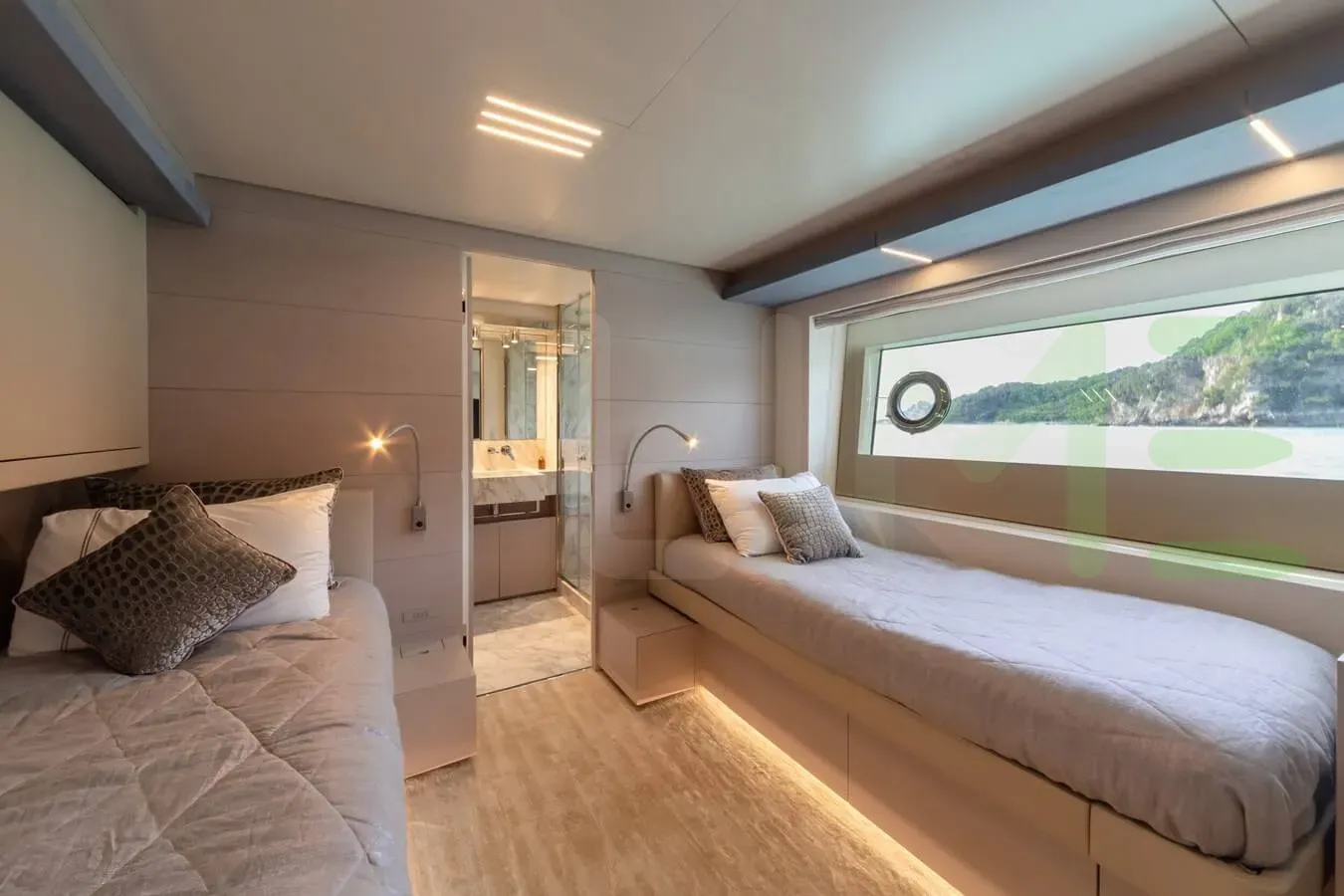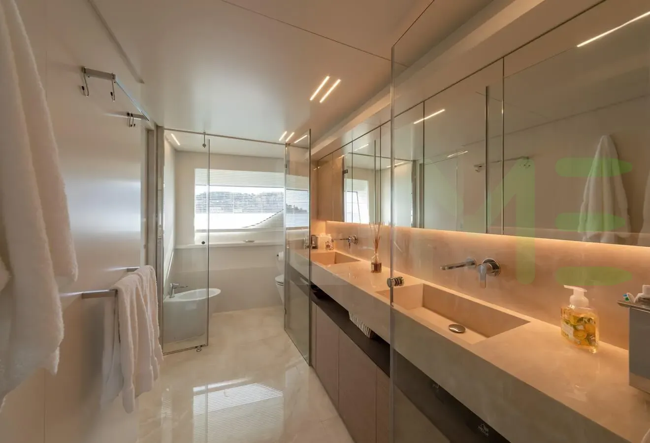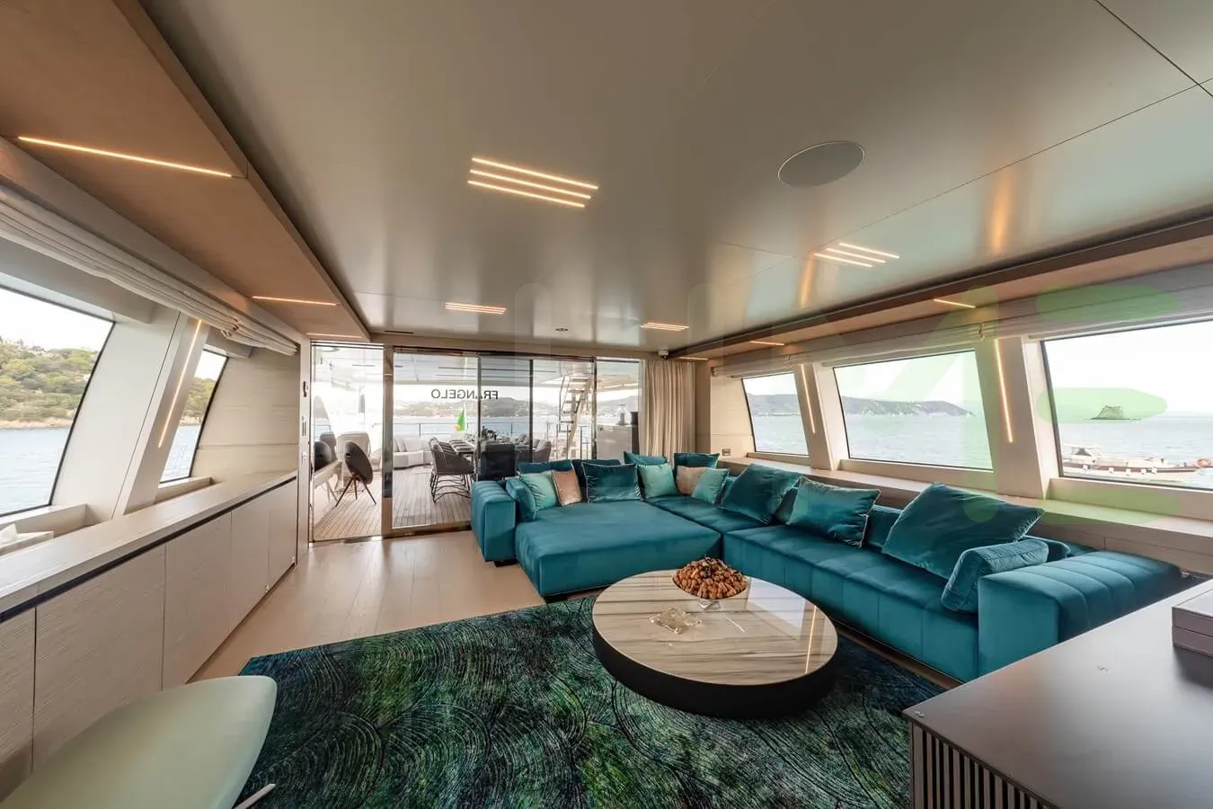 The exterior, designed by Zuccon International Project, captures your attention with beautiful lines and impeccable craftsmanship. Whether you're lounging on the spacious decks or enjoying water sports in a secluded anchorage, the FRANGELO yacht for charter, built of GRP, offers a wealth of opportunities for relaxation and adventure.