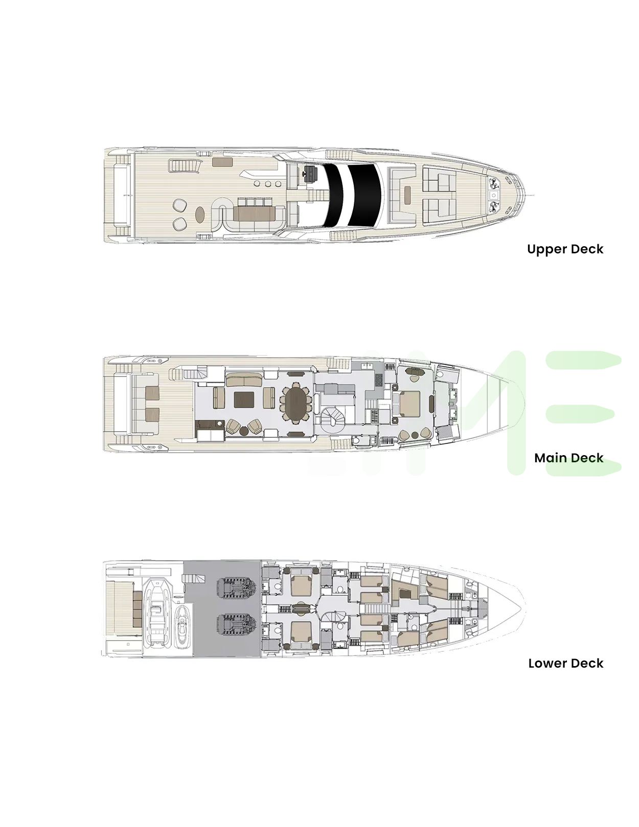 Request plans that include the layout of staterooms, guest areas, and outdoor spaces, as well as crew quarters and work areas.
