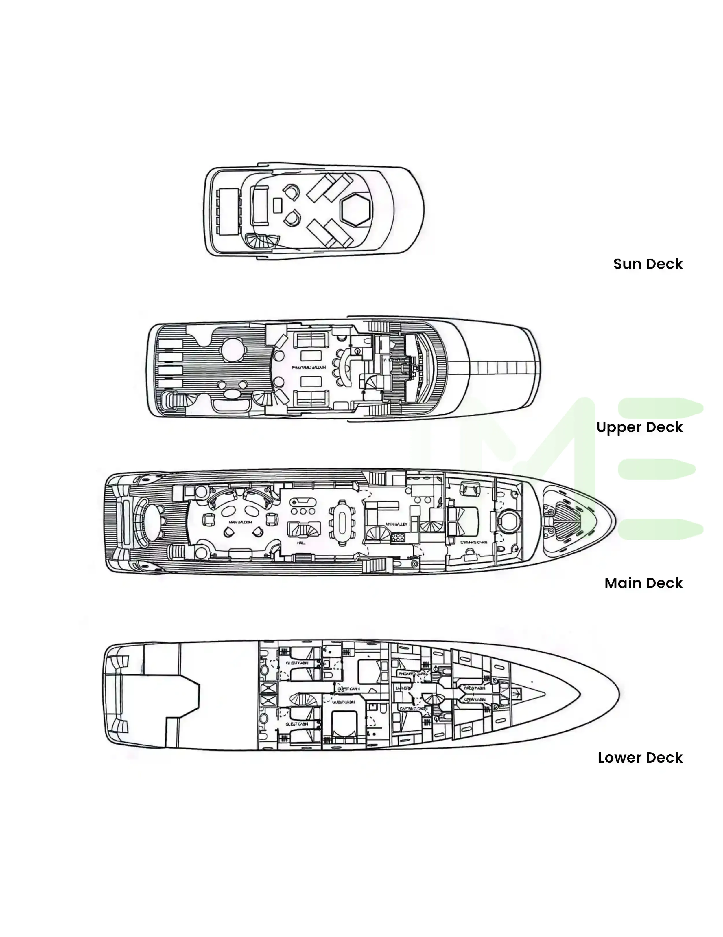 Request plans that include the layout of staterooms, guest areas, and outdoor spaces, as well as crew quarters and work areas.